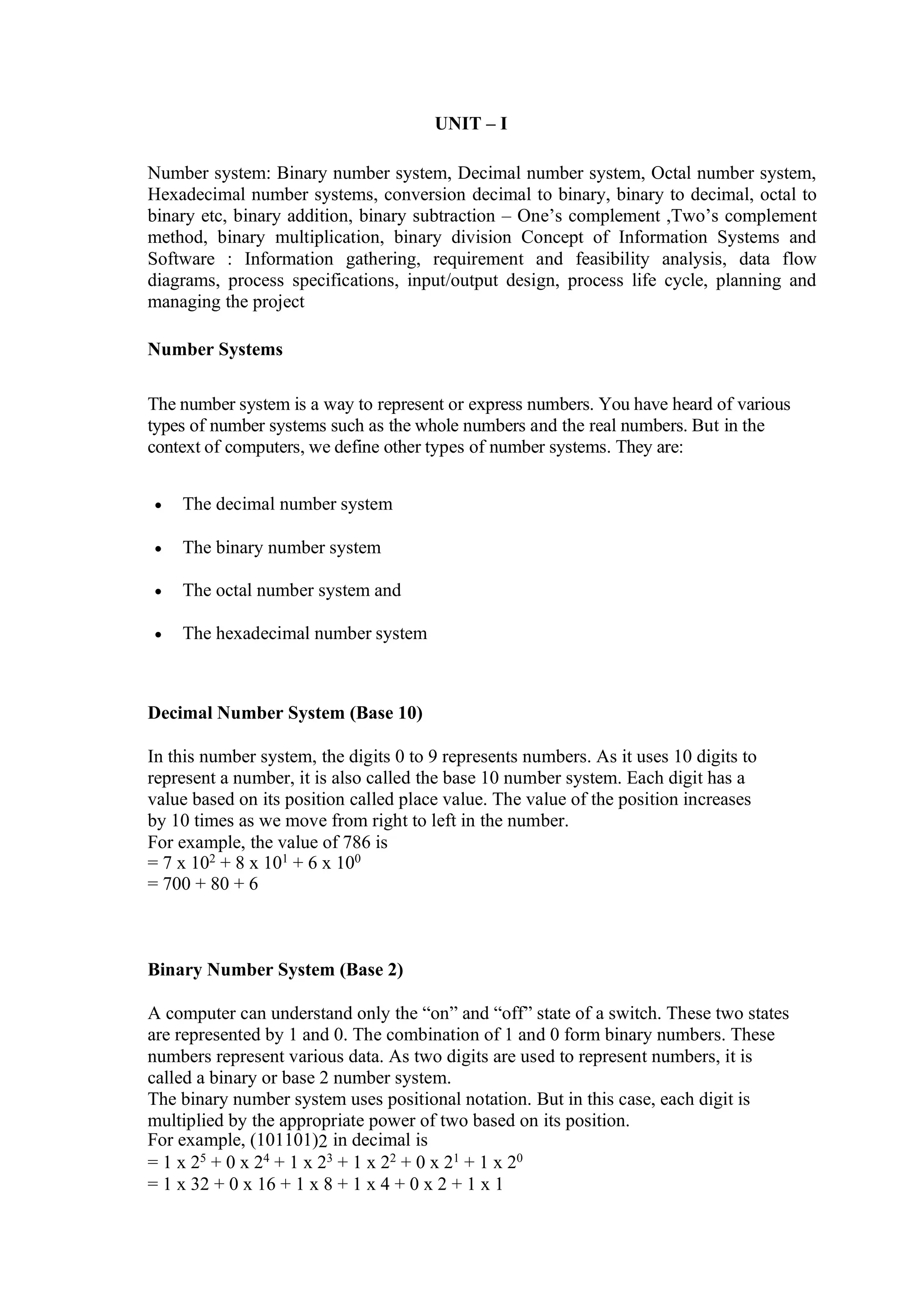 The document provides an overview of various number systems including decimal, binary, octal, and hexadecimal, with explanations on conversion methods and operations such as addition and subtraction in binary. It also discusses the components and types of information systems, details about project management, and an introduction to web technologies like HTML and XML. Lastly, it covers programming languages and their characteristics in the context of computer applications in pharmacy.