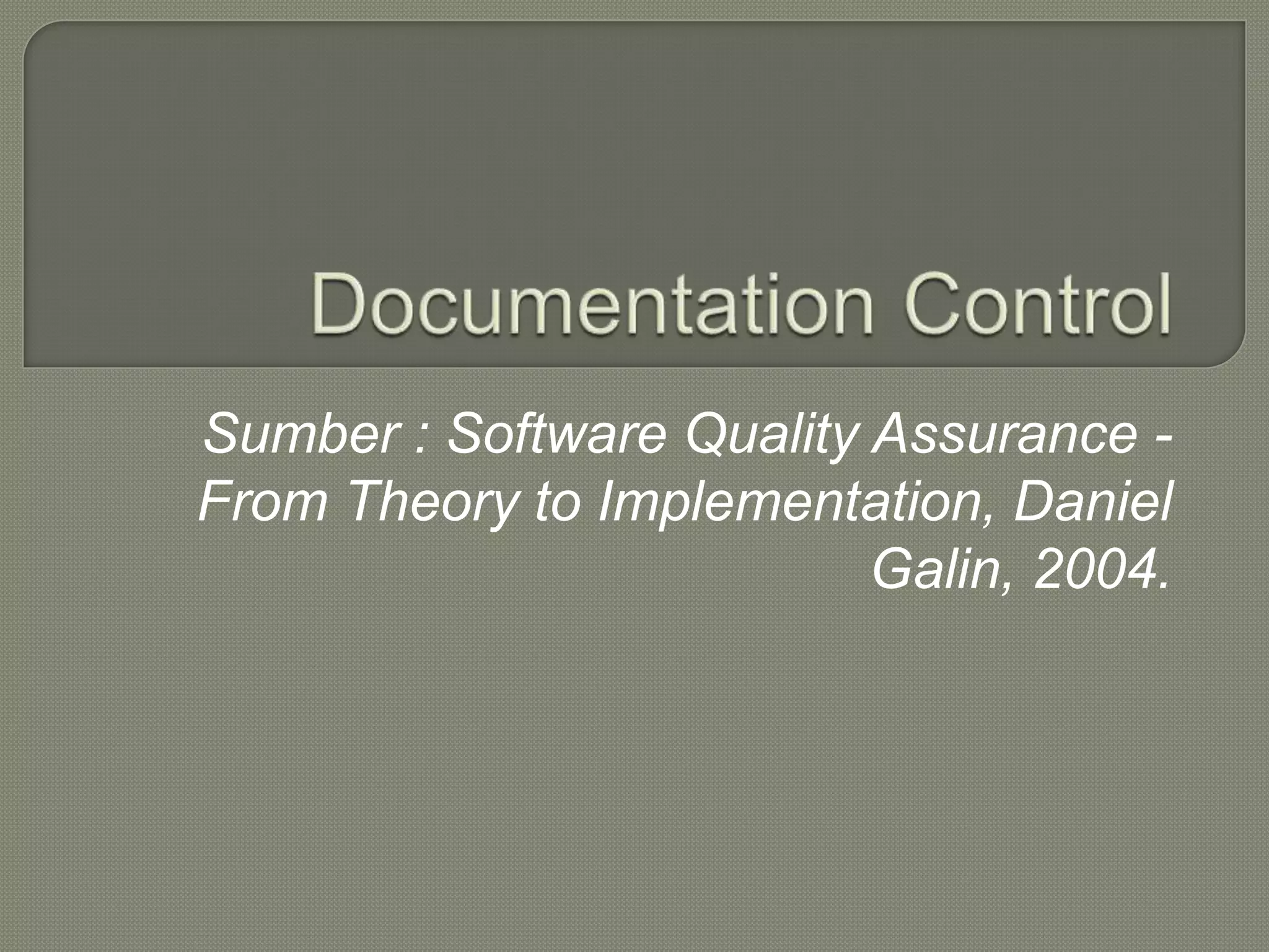 Dokumen ini menjelaskan pentingnya dokumentasi dalam pengembangan dan pemeliharaan sistem perangkat lunak serta manajemen hubungan pelanggan. Ini mencakup persyaratan untuk kontrol dokumen, termasuk persiapan, persetujuan, penyimpanan, dan pengelolaan versi serta revisi. Keberadaan dokumentasi yang terstruktur berkontribusi pada kesesuaian pembangun dengan kebutuhan pelanggan dan efisiensi operasi sistem jaminan kualitas perangkat lunak.