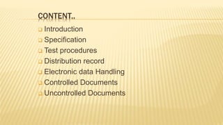Pranjay Sadashiv Patil, a first year M.Pharm student, presented on documentation in pharmaceutical quality assurance. Documentation defines a system to minimize risks from misinterpretation or errors in oral communication. It includes specifications, test procedures, distribution records, and electronic data handling. Specifications provide parameters and limits for materials, equipment, and products. Test procedures must validate compliance to the end of shelf life. Controlled documents require approval and management of changes, while uncontrolled copies are for reference with a watermark.