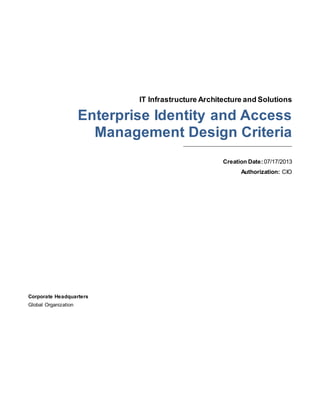 Global Organization currently manages identities and access across multiple independent systems. The document recommends implementing an enterprise identity and access management solution with single sign-on capabilities to consistently manage users and their access. It provides details on Global Organization's current environment, including multiple Active Directory forests, ADFS/SAML for SSO, and various identity management and access management systems. The recommendation is for a solution that supports standards like SAML while integrating with Global Organization's diverse applications and systems.