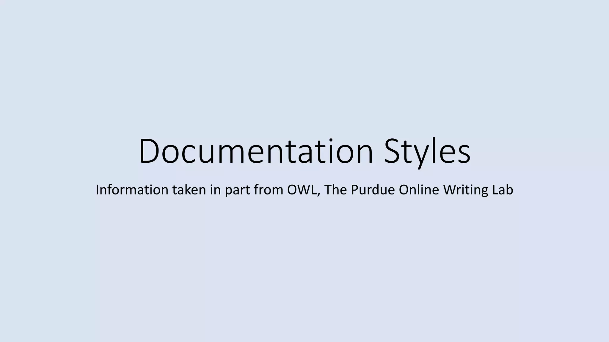 The document discusses several documentation styles used in academic writing. It provides details on MLA style, which is used in the humanities, and APA style, which is used in the social sciences. Key elements of citations in each style are outlined, including author name formatting, publication date, and digital object identifiers. The document also briefly mentions several other common documentation styles used in different fields.