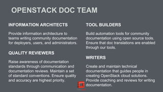 The OpenStack documentation update for the Kilo release outlines the roles of the documentation team, which includes writers, reviewers, and tool builders, and highlights key accomplishments from the Juno release. Major goals for Kilo focus on enhancing documentation quality, optimizing for automation, and improving user experience through a modern web design. The roadmap includes specific initiatives such as migrating to RST format, maintaining current guides, and updating various documentation resources by the April 30 Kilo release date.