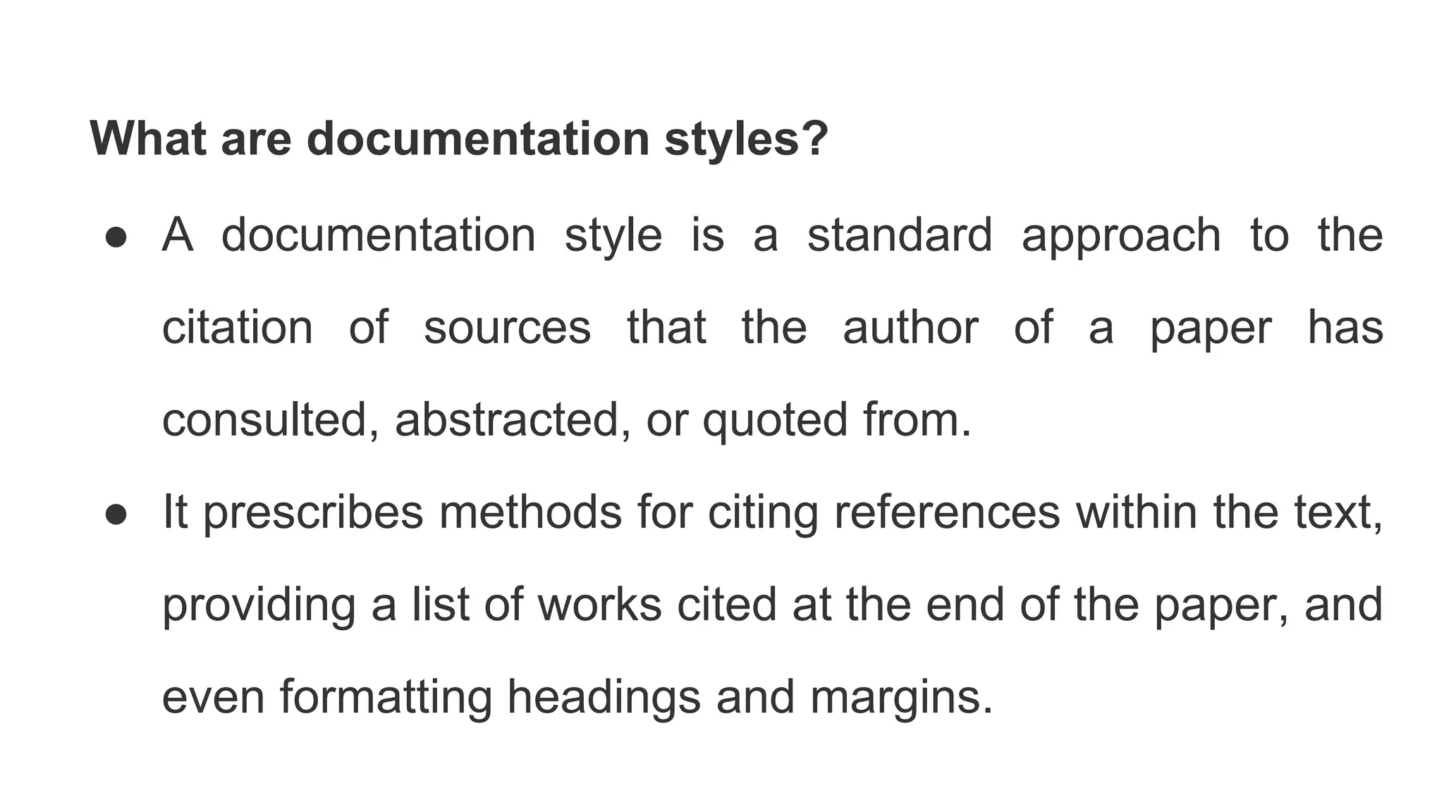 This document discusses documentation styles, which are standard approaches for citing sources in academic papers. It explains that different disciplines typically use different documentation styles and instructors may require a specific style. The key purposes of citations are to give credit to original authors and allow readers to locate sources. Plagiarism involves presenting others' work as one's own without proper citation. The document provides guidance on gathering source information, placing citations in papers, and choosing an appropriate documentation style based on course requirements, disciplinary conventions, or personal preference.