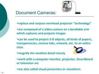 This document proposes purchasing an AVerMedia AVerVision 355AF 5MP document camera for a third grade classroom. It details how document cameras can replace overhead projectors by projecting 3D objects, papers, and experiments for students to see. The document provides evidence from several school districts that found document cameras improved student engagement, understanding, and presentation skills. It suggests the document camera could be used across subjects to enhance lessons and meet technology standards. Total cost is $833 and possible funding sources are identified.