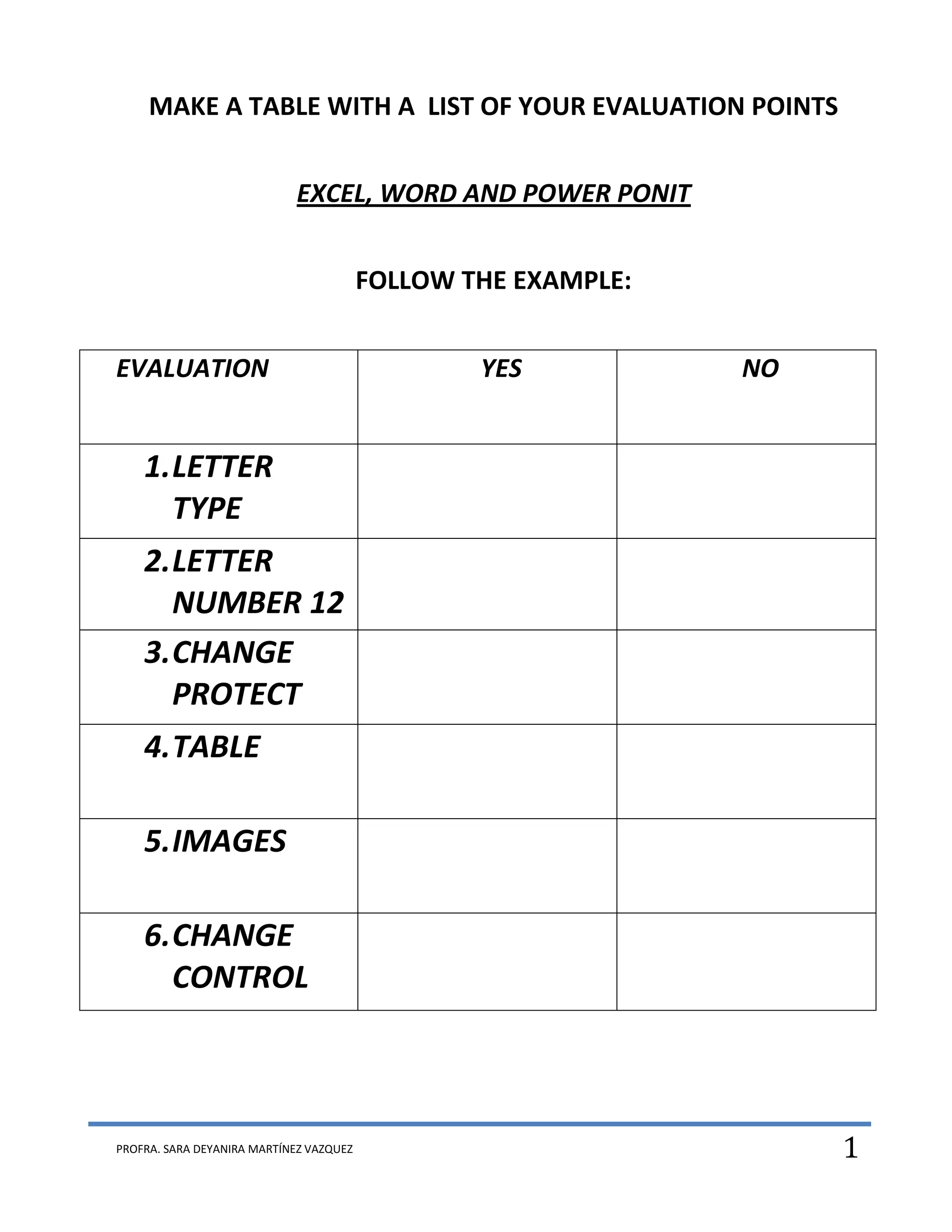 The document provides an example of an evaluation table with columns for "YES" and "NO" answers. The table includes evaluation points about Excel, Word, and PowerPoint features such as letter type, letter number, change protection, tables, images, and change control. Students are asked to fill out the table to evaluate their knowledge of the specified programs.