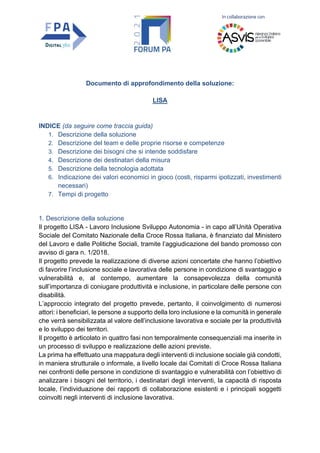 Il progetto LISA, finanziato dal ministero del lavoro e della Croce Rossa Italiana, si propone di favorire l'inclusione sociale e lavorativa di persone vulnerabili tramite un approccio integrato, formando volontari e creando reti locali. Le azioni prevedono una mappatura dei bisogni, la formazione di 600 volontari e l'accompagnamento lavorativo di 3000 persone. Il progetto ha una durata di 18 mesi e si culminerà con la valorizzazione dei risultati e la sensibilizzazione della comunità sul valore dell'inclusione.