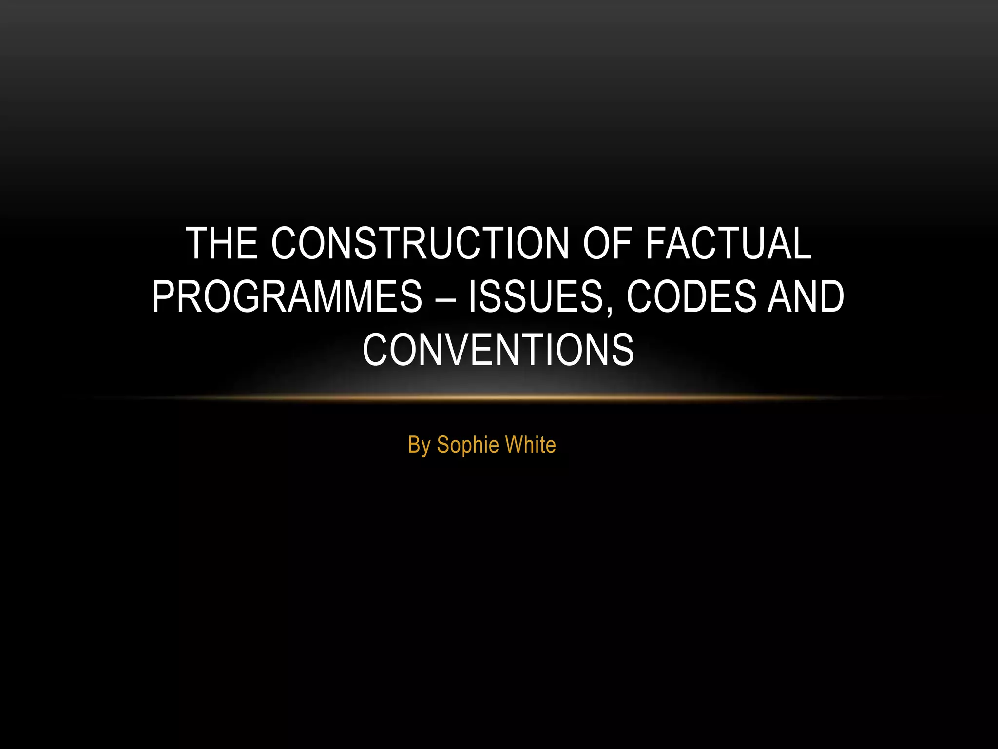 This document discusses different types of factual programming and documentary styles. It describes the codes and conventions used in factual productions like documentaries and news programs. It then analyzes five modes of documentary: expository, observational, participatory, reflexive, and performative. For each mode, it provides characteristics and examples to illustrate how they differ in their approach and what they aim to show the audience.