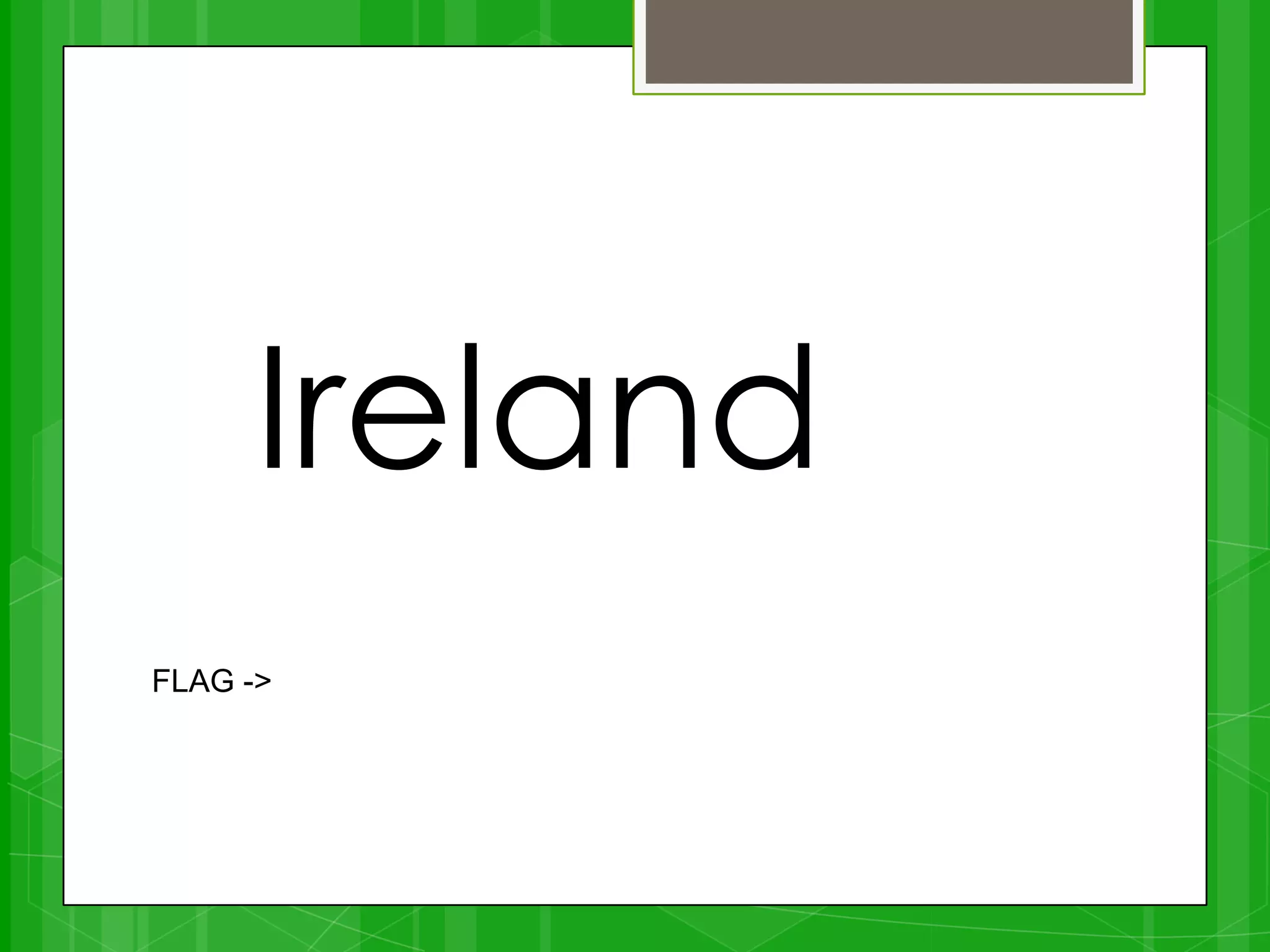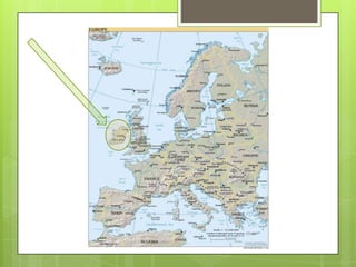Ireland is an island located off the northwest coast of Europe, with Britain to its east and separated from the rest of Europe. It is divided into two countries - Ireland and Northern Ireland. Dublin is the capital of Ireland and Belfast is the capital of Northern Ireland. Irish culture includes traditions like Gaelic sports, Irish music played on instruments like the bodhrán and uilleann pipes, Irish dance, Catholicism, and Irish festivals. Famous Irish exports include Guinness beer and Irish rock bands like U2.