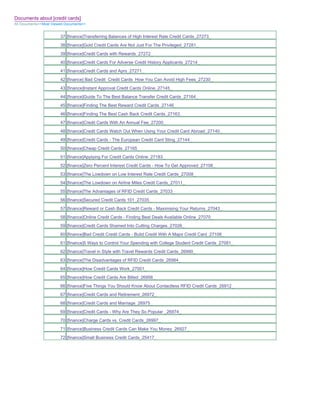 The document lists 115 documents related to credit cards. The documents discuss various types of credit cards like department store cards, gas station cards, student cards, rewards cards, balance transfer cards, cash back cards, and business cards. They provide information on choosing the right card, using cards responsibly, avoiding fees, and building or repairing credit. The documents also cover topics like how credit cards work, interest rates, rewards programs, and responsible use.