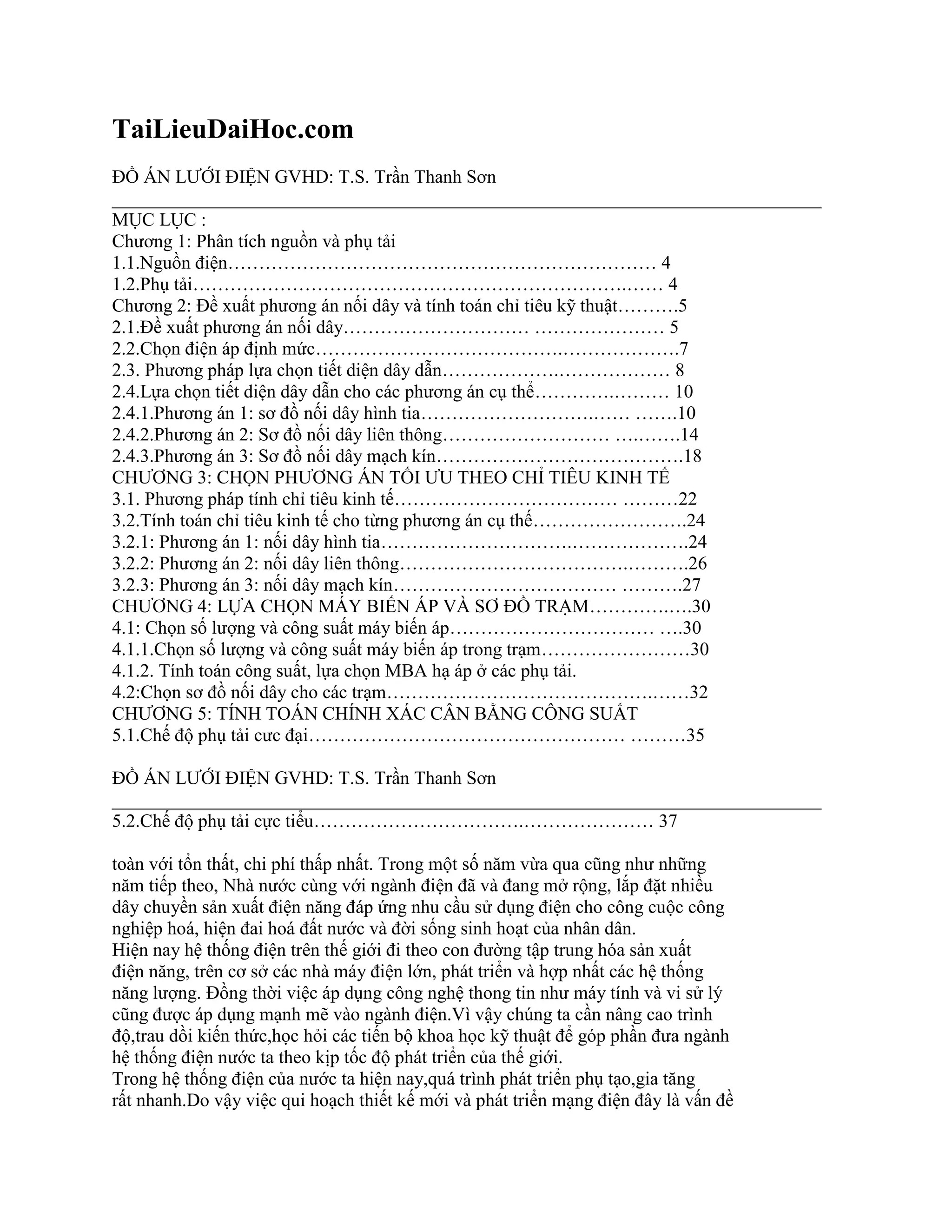 Tài liệu trình bày lại tiến trình thiết kế và phân tích một hệ thống lưới điện với các phương án nối dây khác nhau, bao gồm sơ đồ hình tia, liên thông và mạch kín. Các chương bao gồm phân tích nguồn và phụ tải, đề xuất phương án nối dây, tính toán chỉ tiêu kỹ thuật và kinh tế, cũng như lựa chọn máy biến áp và sơ đồ trạm. Tài liệu nhấn mạnh tầm quan trọng của việc phát triển và hiện đại hóa hệ thống điện để đáp ứng nhu cầu tăng trưởng trong tương lai.