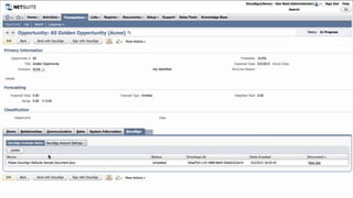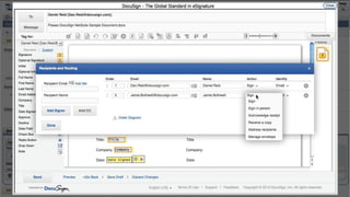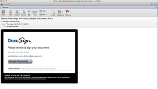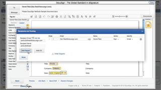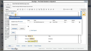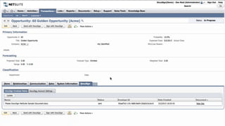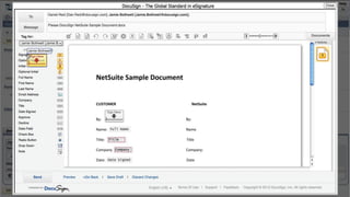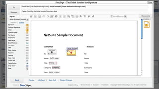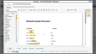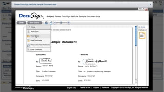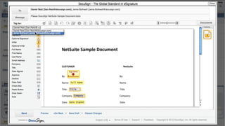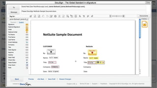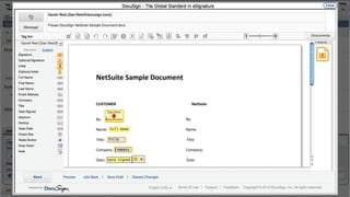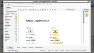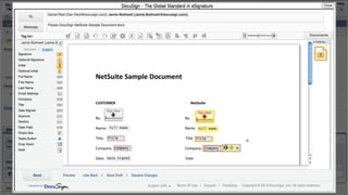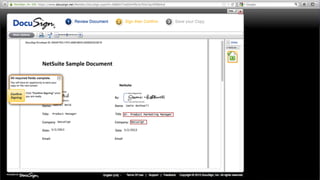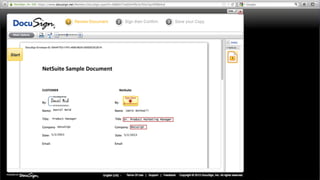 This document introduces DocuSign and how it integrates with NetSuite CRM. It discusses how DocuSign helps address challenges in today's sales environment by allowing users to stay digital, mobile, easy to use, and increase execution speed. DocuSign automates electronic signature and transaction management. It can integrate with NetSuite via pre-built connectors or custom integrations. A demo is shown of how DocuSign streamlines contract execution from within NetSuite.