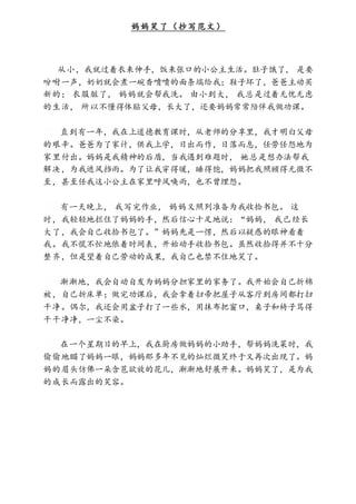 妈妈笑了(抄写范文) 从小,我就过着衣来伸手,饭来张口的小公主生活。肚子饿了, 是要 吩咐一声,奶奶就会煮一碗香喷喷的面条端给我;鞋子坏了,爸爸主动买 新的; 衣服脏了,