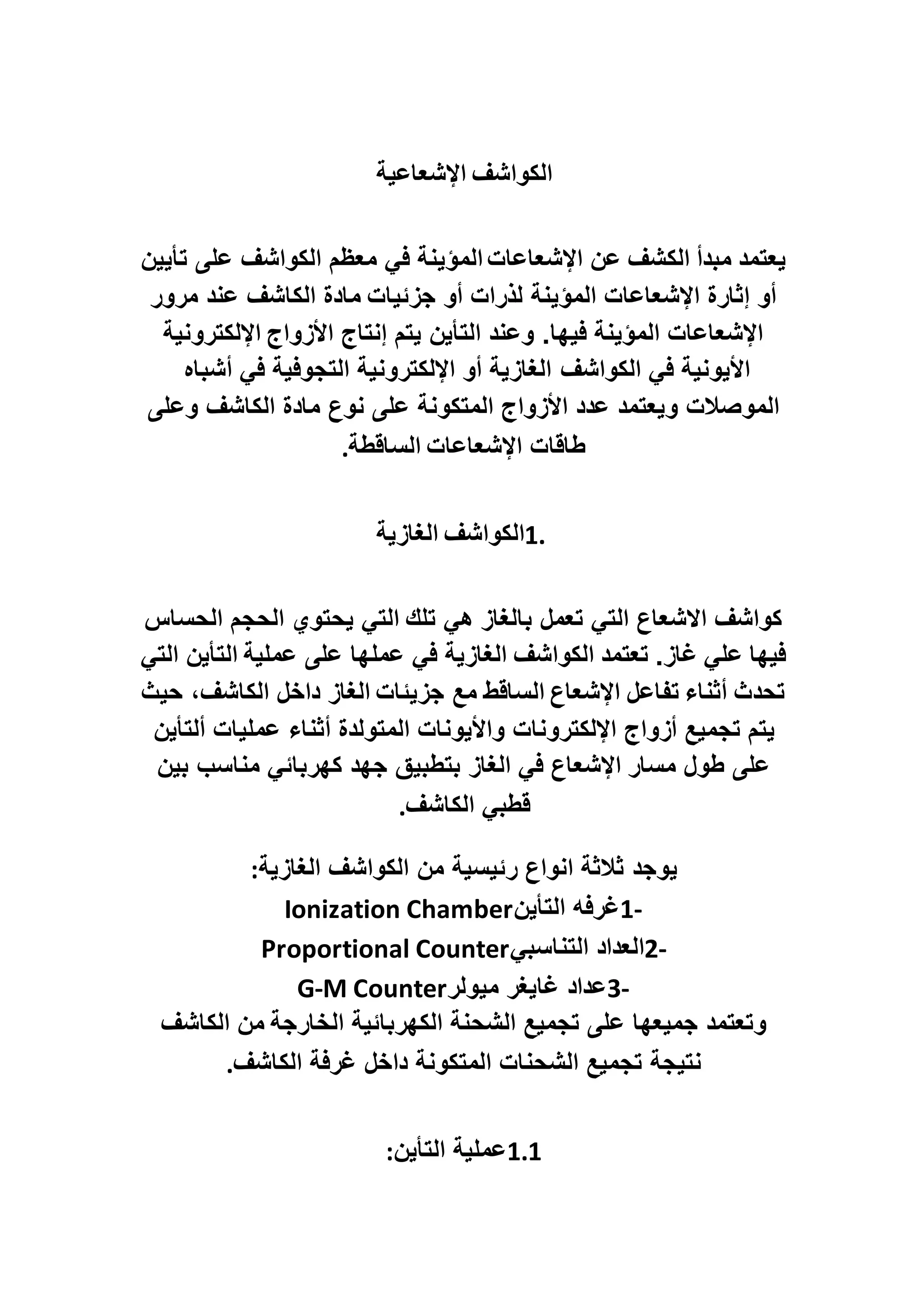 تعتمد الكواشف الإشعاعية على تأيين الجزيئات أو الذرات من خلال إشعاعات مؤينة، وتستخدم عدة أنواع مثل غرف التأين والعدادات التناسبيّة والأعداد غايغر. تُستخدم هذه الكواشف لقياس الشحنة الكهربائية الناتجة عن التأين الناتج عن تفاعل الإشعاع مع الغاز داخل الكاشف. تتأثر فعالية الكواشف بجهد كهربائي محدد يتم تطبيقه، مما يؤثر بشكل مباشر على كفاءة الكشف عن الأشعة.
