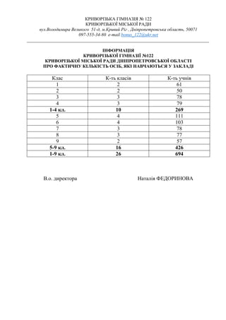 Фактична кількість осіб, які навчаються у Криворізькій гімназії №122