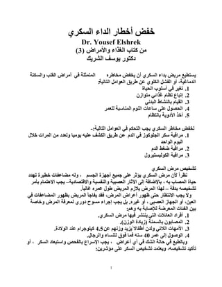 خفغ Dr. Yousef Elshrek ٚا٤ِشاع اٌغزاء وزبة ِٓ(3) اٌشش٠ه ٠ٛعف دوزٛس ِٖخبؽش ٠خفغ ْأ ٞاٌغىش ثذاء ِش٠غ ٠غزط١غٟف اٌّزّثٍخٚاٌغىزخ اٌمٍت أِشاع اٌزبٌ١خ ًِاٌؼٛا ؽش٠ك ٓػ ٍٞٛاٌى ًاٌفش ٚأ ،اٌذِبغ١خ: 1.اٌس١بح أعٍٛة ٟف رغ١ش 2.ِْزٛاص ٟغزائ َٔظب إرجبع 3.ٟٔاٌجذ ثبٌٕشبؽ َاٌم١ب 4.ٌٍؼّش إٌّبعجخ ٌَٕٛا عبػبد ٍٝػ اٌسظٛي 5.َثبٔزظب ا٤دٚ٠خ أخز اٌزبٌ١خ ًِاٌؼٛا ٟف ُاٌزسى ٠دت ٞاٌغىش ِخبؽش ٌخفغ-: 1.َاٌذ ٟف اٌدٍٛوٛص عىش ِشالجخخ٩ي اٌّشاد ِٓ ٌٚؼذد ٠ِٛ١ب ٗ١ٍػ اٌىشف ؽش٠ك ٓػ اٌٛازذ َٛ١ٌا 2.َاٌذ ػغؾ ِشالجخ 3.اٌىٌٛ١غز١شٚي ِشالجخ اٌغىش ِشع رشخ١ضٞ ُاٌدغ أخٙضح خّ١غ ٍٝػ ٠ؤثش ٞاٌغىش ِشع ْ٤ ًأظش،رٙذد خط١شح ِؼبػفبد ٌٗٚ ٗث اٌّظبة ز١بح،ٚا٨لزظبد٠خ ٚإٌفغ١خ اٌؼظج١خ ا٢ثبس ٌٝإ ثب٦ػبفخ–ثأِش َا٨٘زّب ٠دت ثذلخ ٗرشخ١ظ–ًبغبٌج ٖػّش ؽٛي اٌّش٠غ َ٠٩ص اٌّشع ٌٙزا. ٟف اٌّؼبػفبد ثظٙٛس اٌّش٠غ ٠فبخأ فمذ ،اٌّشع أػشاع ظٙٛس ٝزز ا٨ٔزظبس ٠دت ٨ٚ ٓ١اٌؼ،ٟاٌؼظج اٌدٙبص ٚأ،ٖغ١ش ٚأ.ٚخبطخ اٌّشع ٌّؼشفخ ٞدٚس ِغٛذ إخشاء ٠دت ًث ُ٘ٚ ٗث ٌ٧طبثخ اٌّؼشػخ اٌفئبد ٓ١ث: 1.ٟاٌز اٌؼبئ٩د أفشاد٠ٕزششٞاٌغىش ِشع ف١ٙب. 2.ثبٌغّٕخ ْٛاٌّظبث(ْاٌٛص ص٠بدح). 3.ٓػ ُٙٔٚص ً٠ض٠ذ ٨أؽفب ٌْٚذ ٟاٌ٩ر ا٤ِٙبد4.5اٌٛ٨دح ػٕذ َو١ٍٛخشا. 4.ػّش ٌٝإ اٌٛطٛي40ٚاٌشخبي ٌٍٕغبء فٛق فّب ٕٗع. أػشاع ٞأ ٟف اٌشه زبٌخ ٟف ٚثبٌطجغ،اٌغىش ٚاعزجؼبد ثبٌفسض ا٦عشاع ٠دت،ٚأ ٗرشخ١ظ رأو١ذ،ٓ٠ِؤشش ٍٝػ اٌغىش رشخ١ض ٚ٠ؼزّذ: