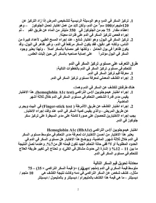 رشو١ض:ٓػ اٌزشو١ض صاد إرا اٌّشع ٌزشخ١ض اٌشئ١غ١خ اٌٛع١ٍخ ٛ٘ٚ 120ٍَِ١دشا/100ُع3 اٌدٍٛوٛص ًّرس اخزجبس ًّػ ِٓ ٨ثذ ٌٓٚى ،َاٌذ ِٓ–ٛ٘ٚ ِمذاس إػطبء75ٟف اٌدٍٛوٛص ِٓ ُخ350ُاٌف ؽش٠ك ٓػ اٌّبء ِٓ ٍِ١ٍزش-ُث ِؼ١ٕخ فزشاد ٍٝػ َاٌذ ٟف اٌغىش ٌزشو١ض فسض إخشاء. 2.اٌجٛي ٟف اٌغىش رشو١ض:شبئغ اخزجبس ٛ٘ٚ،ٟاٌطج اٌّغر إخشاء ػٕذ،ِٓ وج١شح ٤ػذاد إٌبط،َاٌذ ٟف ًبِشرفؼ اٌغىش ْٛ٠ى فمذ ،دل١ك غ١ش ٌٕٗٚى،ٚلذ ،اٌجٛي ٟف ظب٘ش ٚغ١ش ًِاٌسب ثٛي ٟف ًاظب٘ش ْٛ٠ى،ً٩أط ثبٌغىش ِظبثخ غ١ش ٌٚىٕٙب،ٚخٛد ٠ؼزجش ٌٚٙزا ًاِؤشش اٌجٛي ٟف اٌغىشاٌؼىظ إثجبد ٓ١ز ٌٝإ ثبٌغىش ٗطبزج إطبثخ ٍٝػ. َاٌذ ٟف اٌغىش رشو١ض ِٜٛغز ٍٝػ اٌزؼشف ؽشق اٌزبٌ١خ ثبٌخطٛاد َاٌذ ٟف اٌغىش رشو١ض ِٜٛغز ٟف ٌٍُزسى: 1.َاٌذ ٟف اٌغىش رشو١ض ُ١ل ِؼشفخ. 2.َاٌذ ٟف اٌغىش رشو١ض ِٜٛغز ٌّؼشفخ ٍّٟاٌّؼ اٌىشف إخشاء. ؽشلذ ٕ٘بناّٚ٘ب َاٌذ ٟف اٌغىش ٓػ ٌٍىشف ْ-: 1.أ ٓ١٘١ّٛخٍٛث اخزجبس إخشاء1ّٟاٌزشاو طhemoglobin A1c test)).ا٨خزجبس ٘زا أشٙش ث٩ثخ خ٩ي َاٌذ ٟف اٌغىش ِٜٛغز ٟف ُاٌزسى اٌشخض لذسح ِٜذ ٠م١ظ اٌّبػ١خ. 2.ا٤ششؽخ ؽش٠ك ٓػ اٌىشف اخزجبس إخشاء(Finger-stick test)ٟفٜٚ٠دش اٌج١ذ ، اٌّش٠غ ؽش٠ك ٓػَاٌذ ٟف اٌغىش وّ١خ ٠م١ظ ٞٚاٌز،ا٨خزجبس إخشاء ٚلذ ػٕذ. عىش رشو١ض ٍٝػ اٌغ١طشح ِٜذ ٍٝػ وبٍِخ طٛسح ٍٝػ ٌٍسظٛي ٓ٠ا٨خزجبس إخشاء ٠دت َاٌذ ٟف خٍٛوٛص. أ ٓ١٘١ّٛخٍٛث اخزجبس1ّٟاٌزشاو ط(Hemoglobin A1c (HbA1c اٌغىش ِٜٛغز ِزٛعؾ ٟف ُاٌزسى ِٜذ ٌّؼشفخ ا٨خزجبساد ٓأزغ ِٓ ا٨خزجبس ٘زا ٠ؼزجش ٟف َاٌذ ٟف اٌغىش ِٜٛغز ً٘ ا٨خزجبس ٘زا ٚ٠ٛػر ،اٌّبػ١خ شٙٛس ث٩ثخ خ٩ي َاٌذ ٟف ِٓ ًأل ٗل١ّز ْٛرى اٌد١ذ ُاٌزسى زبٌخ ٟفف ٨؟ ٚأ اٌّطٍٛثخ اٌسذٚد7.%إٌز١دخ ًرظ ٚػٕذِب ٓ١ث ِب11–12%(إشبسحٍٝاٌى ٟف ًِشبو زذٚس ٌٝإ)اٌؼ٩ج ؽش٠مخ رغ١١ش ٌٝإ رسزبج ٚ ، َاٌذ ٟف اٌغىش ِٜٛغز ٟف ٌٍُزسى. اٌزبٌ١خ اٌغىش ُ١ل ً٠ٛرس ِؼبدٌخ َاٌذ ٟف ٞاٌغىش ل١ّخ ِزٛعؾ(ٍُِد/دٞطٞيرش)=(ّٟاٌزشاو اٌغىش ل١ّخ×35)–75 ِثبي-:ٟ٘ اٌىشف ٔز١دخ ٚوبٔذ ِٗد ٟف ّٟاٌزشاو اٌغىش ٓػ شخض وشف10ٍُِد/ َثبٌٍّ١دشا اٌىشف ٘زا ل١ّخ ٟ٘ ِب ، د٠غ١ٍزش/ثبٌٍّ١ّٛي ٚ د٠غ١ٍزش/د٠غ١ٍزش