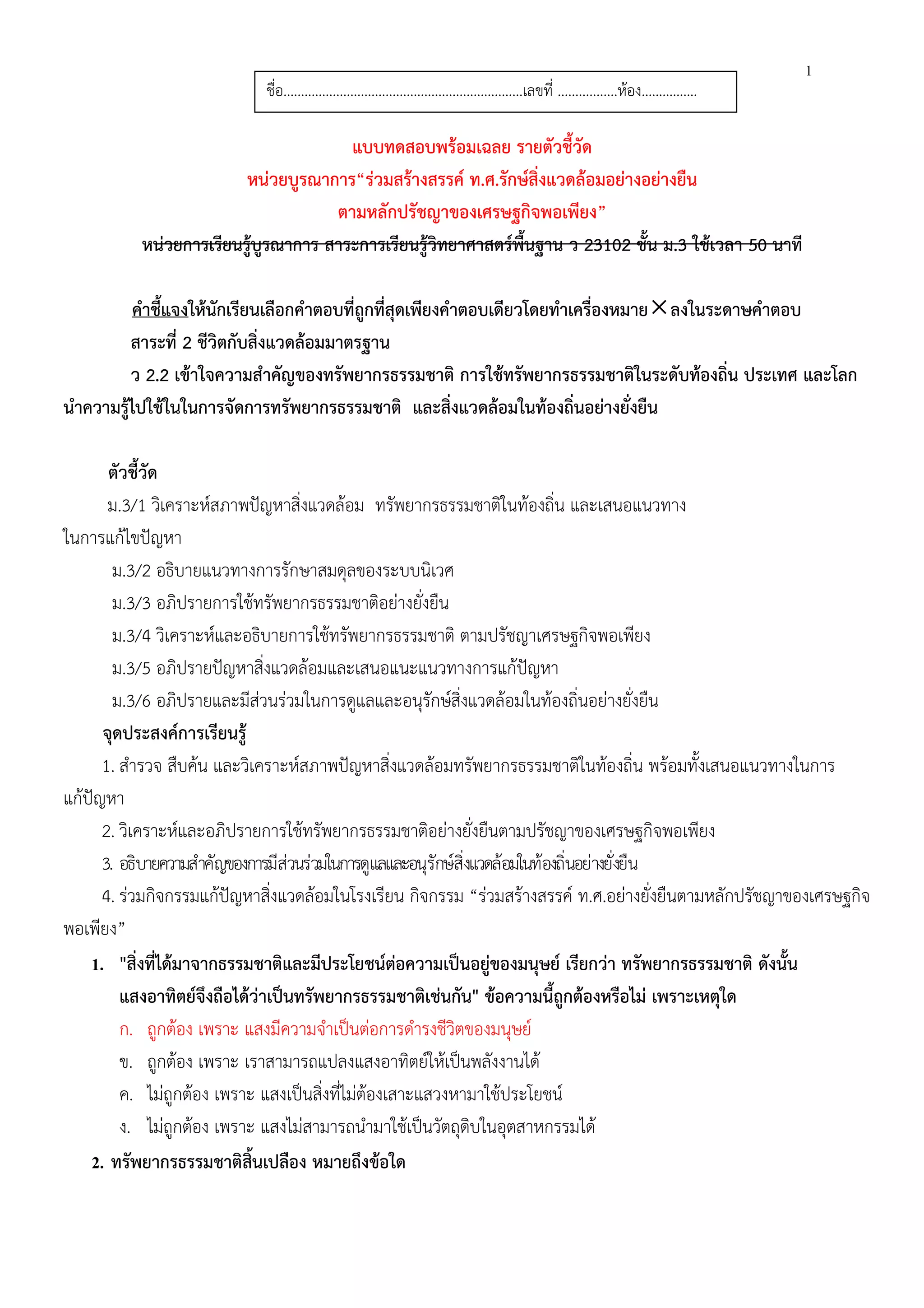 สาระการเรียนรู้วิทยาศาสตร์พื้นฐาน ว 23102 ชั้น ม.3 ใช้เวลา 50 นาที คําชี้แจงให้นักเรียนเลือกคําตอบที่ถูกที่สุดเพียงคําตอบเดียวโดยทําเครื่องหมาย ลงในระดาษคําตอบ สาระที่ 2 ชีวิตกับสิ่งแวดล้อมมาตรฐาน ว 2.2 เข้าใจความสําคัญของทรัพยากรธรรมชาติ การใช้ทรัพยากรธรรมชาติในระดับท้องถิ่น ประเทศ และโลก นําความรู้ไปใช้ในในการจัดการทรัพยากรธรรมชาติ และสิ่งแวดล้อมในท้องถิ่นอย่างยั่งยืน ตัวชี้วัด ม.3/1 วิเคราะห์สภาพปัญหาสิ่งแวดล้อม ทรัพยากรธรรมชาติในท้องถิ่น และเสนอแนวทาง ในการแก้ไขปัญหา ม.3/2 อธิบายแนวทางการรักษาสมดุลของระบบนิเวศ ม.3/3 อภิปรายการใช้ทรัพยากรธรรมชาติอย่างยั่งยืน ม.3/4 วิเคราะห์และอธิบายการใช้ทรัพยากรธรรมชาติ ตามปรัชญาเศรษฐกิจพอเพียง ม.3/5 อภิปรายปัญหาสิ่งแวดล้อมและเสนอแนะแนวทางการแก้ปัญหา ม.3/6 อภิปรายและมีส่วนร่วมในการดูแลและอนุรักษ์สิ่งแวดล้อมในท้องถิ่นอย่างยั่งยืน จุดประสงค์การเรียนรู้ 1. สํารวจ สืบค้น และวิเคราะห์สภาพปัญหาสิ่งแวดล้อมทรัพยากรธรรมชาติในท้องถิ่น พร้อมทั้งเสนอแนวทางในการ แก้ปัญหา 2. วิเคราะห์และอภิปรายการใช้ทรัพยากรธรรมชาติอย่างยั่งยืนตามปรัชญาของเศรษฐกิจพอเพียง 3. อธิบายความสําคัญของการมีส่วนร่วมในการดูแลและอนุรักษ์สิ่งแวดล้อมในท้องถิ่นอย่างยั่งยืน 4. ร่วมกิจกรรมแก้ปัญหาสิ่งแวดล้อมในโรงเรียน กิจกรรม “ร่วมสร้างสรรค์ ท.ศ.อย่างยั่งยืนตามหลักปรัชญาของเศรษฐกิจ พอเพียง” 1. "สิ่งที่ได้มาจากธรรมชาติและมีประโยชน์ต่อความเป็นอยู่ของมนุษย์ เรียกว่า ทรัพยากรธรรมชาติ ดังนั้น แสงอาทิตย์จึงถือได้ว่าเป็นทรัพยากรธรรมชาติเช่นกัน" ข้อความนี้ถูกต้องหรือไม่ เพราะเหตุใด ก. ถูกต้อง เพราะ แสงมีความจําเป็นต่อการดํารงชีวิตของมนุษย์ ข. ถูกต้อง เพราะ เราสามารถแปลงแสงอาทิตย์ให้เป็นพลังงานได้ ค. ไม่ถูกต้อง เพราะ แสงเป็นสิ่งที่ไม่ต้องเสาะแสวงหามาใช้ประโยชน์ ง. ไม่ถูกต้อง เพราะ แสงไม่สามารถนํามาใช้เป็นวัตถุดิบในอุตสาหกรรมได้ 2. ทรัพยากรธรรมชาติสิ้นเปลือง หมายถึงข้อใด ชื่อ....................................................................เลขที่ .................ห้อง…………….