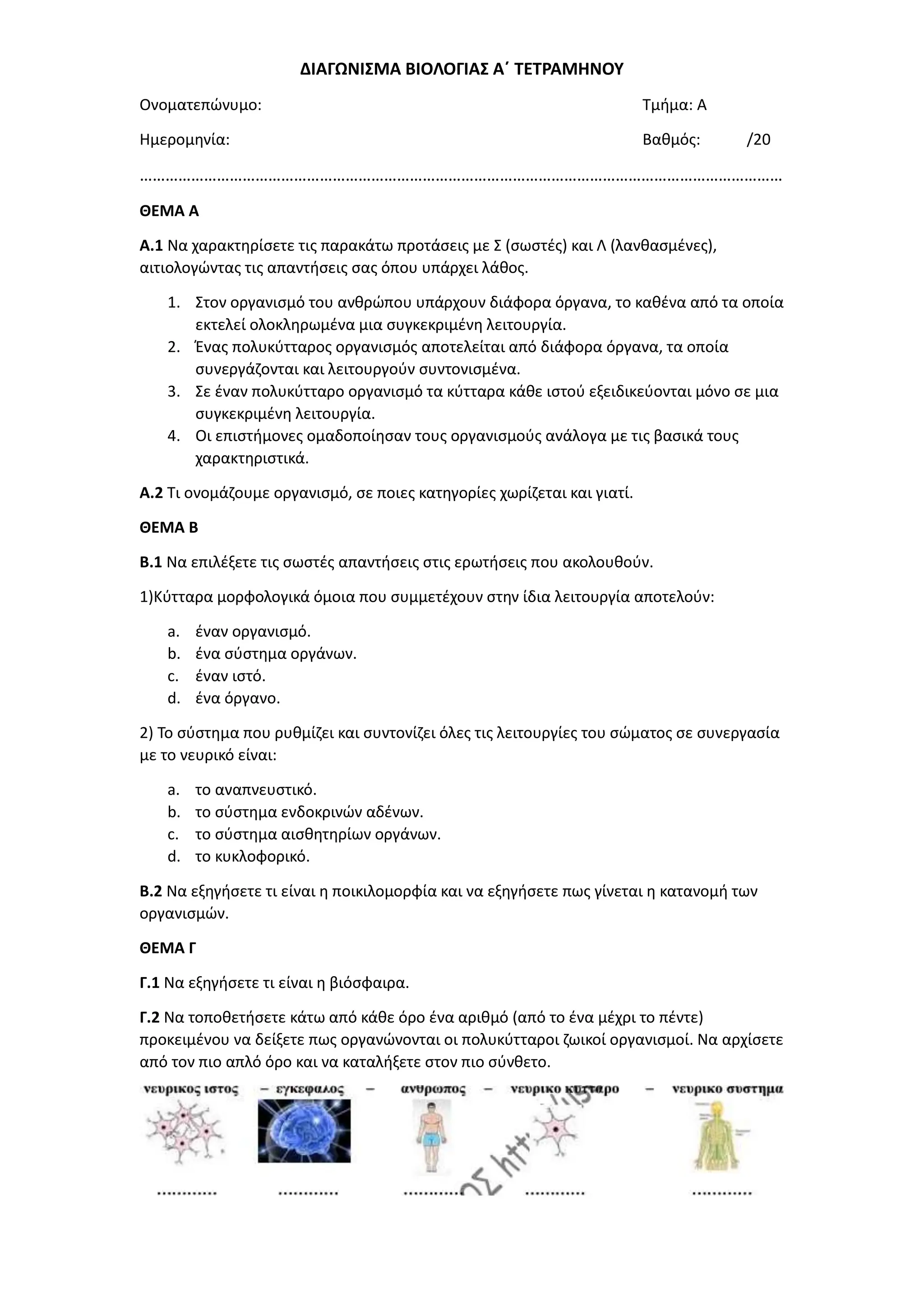 ΔΙΑΓΩΝΙΣΜΑ ΒΙΟΛΟΓΙΑΣ Α΄ΤΕΤΡΑΜΗΝΟΥ