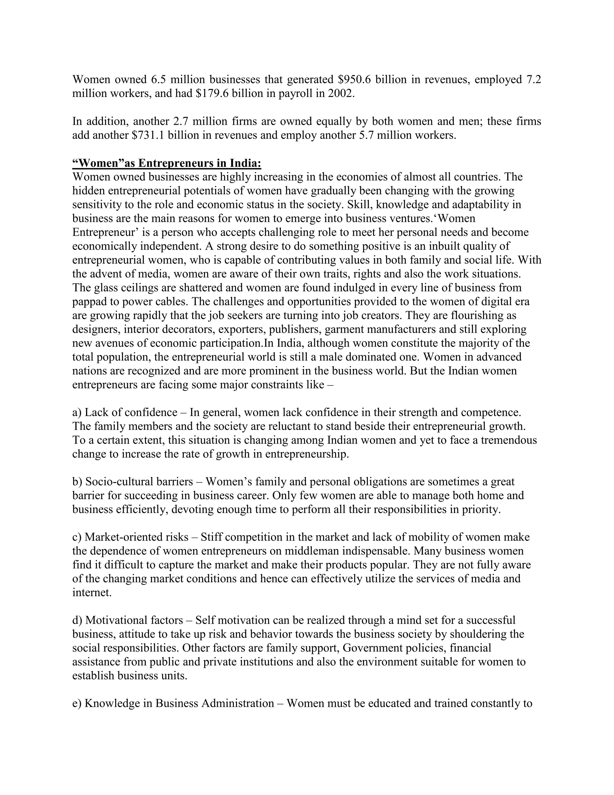 Women owned 6.5 million businesses in the US in 2002, generating $950.6 billion in revenues and employing 7.2 million workers. An additional 2.7 million firms were equally owned by men and women, adding $731.1 billion in revenues and 5.7 million workers. Women entrepreneurs face challenges such as lack of confidence, socio-cultural barriers balancing family and business, lack of market knowledge, and lack of awareness about financial assistance programs. Promoting women's entrepreneurship can help accelerate economic growth by identifying and developing women's untapped talents and providing a supportive environment for women in business.