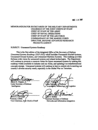 This document provides a summary of the Unmanned Systems Roadmap 2007-2032. It outlines a vision for unmanned systems to project military power while reducing risks to human life over the next 25 years. The roadmap establishes six goals to improve effectiveness through integration, standardization, policies/procedures, control measures, prototyping processes, and cost control. It identifies key mission needs like reconnaissance and surveillance, target identification, counter-mine warfare, and CBRNE reconnaissance to guide research priorities.
