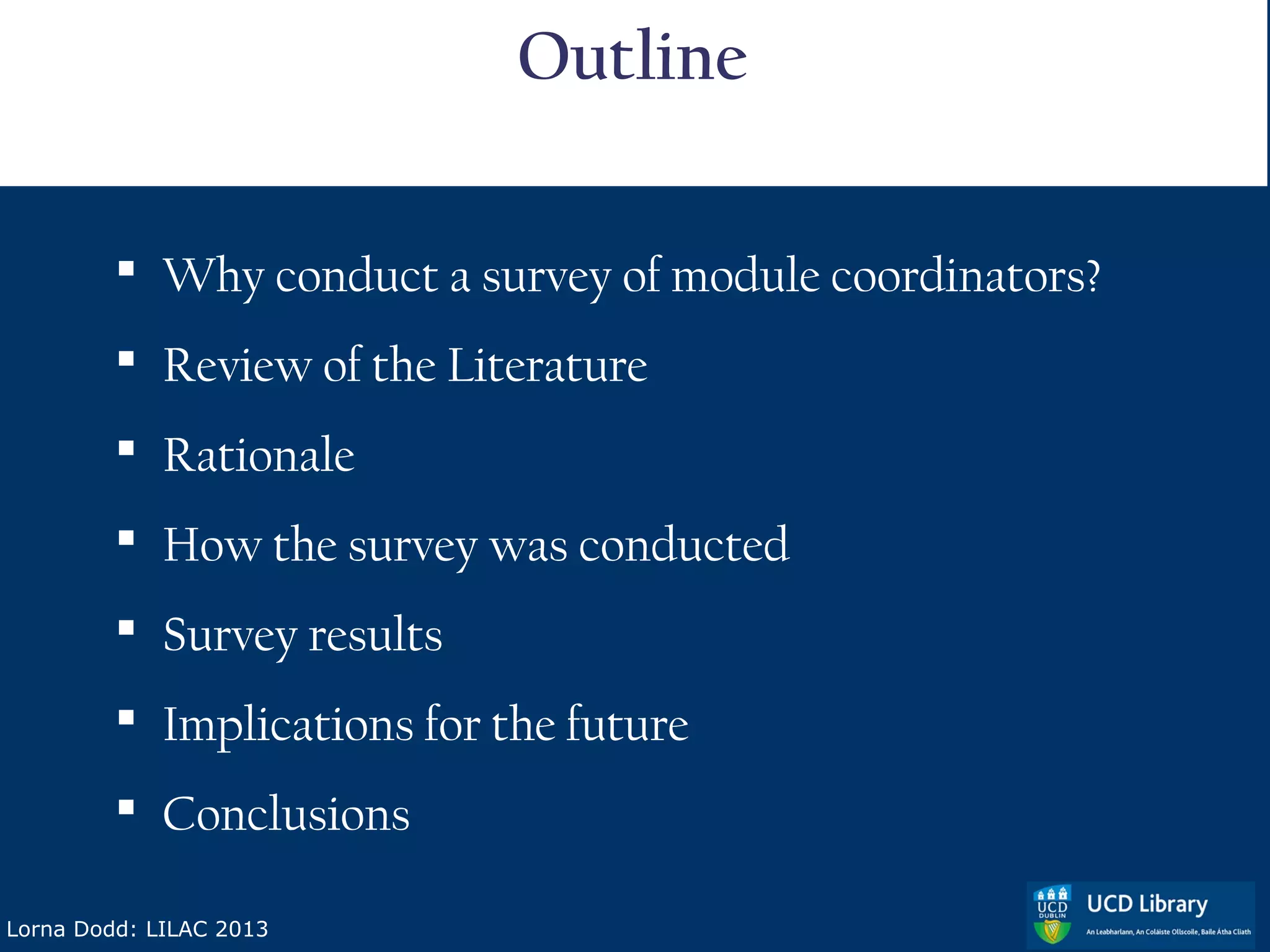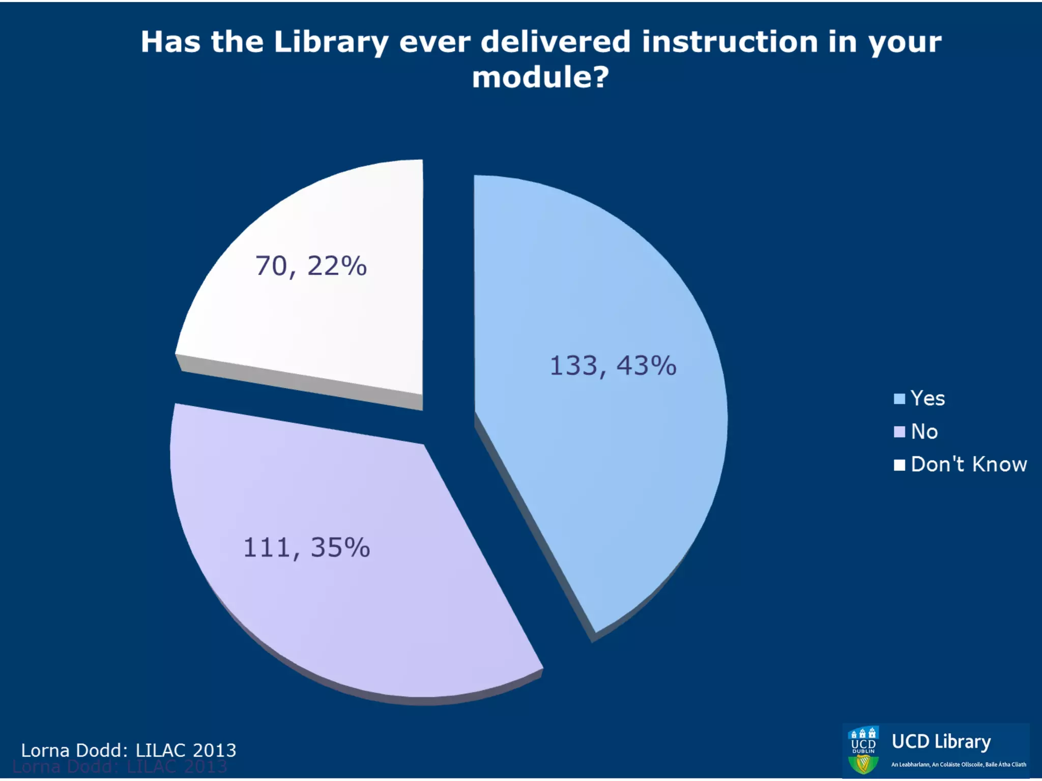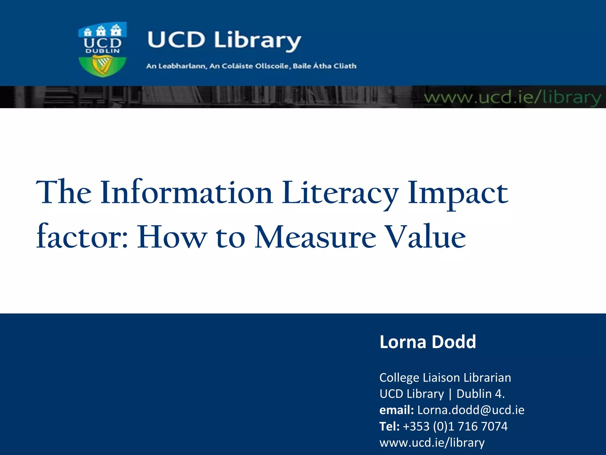 The document discusses a survey conducted by a college liaison librarian at UCD Library in Dublin to measure the impact and value of information literacy instruction. The survey asked module coordinators about past instruction, its impact, and their preferences for future instruction. Results showed that most felt instruction was beneficial and should be provided to all students annually. Workshops tailored to subjects were preferred over online options or tours. The implications are a need to promote instruction's benefits and find sustainable delivery methods beyond workshops given class sizes.
