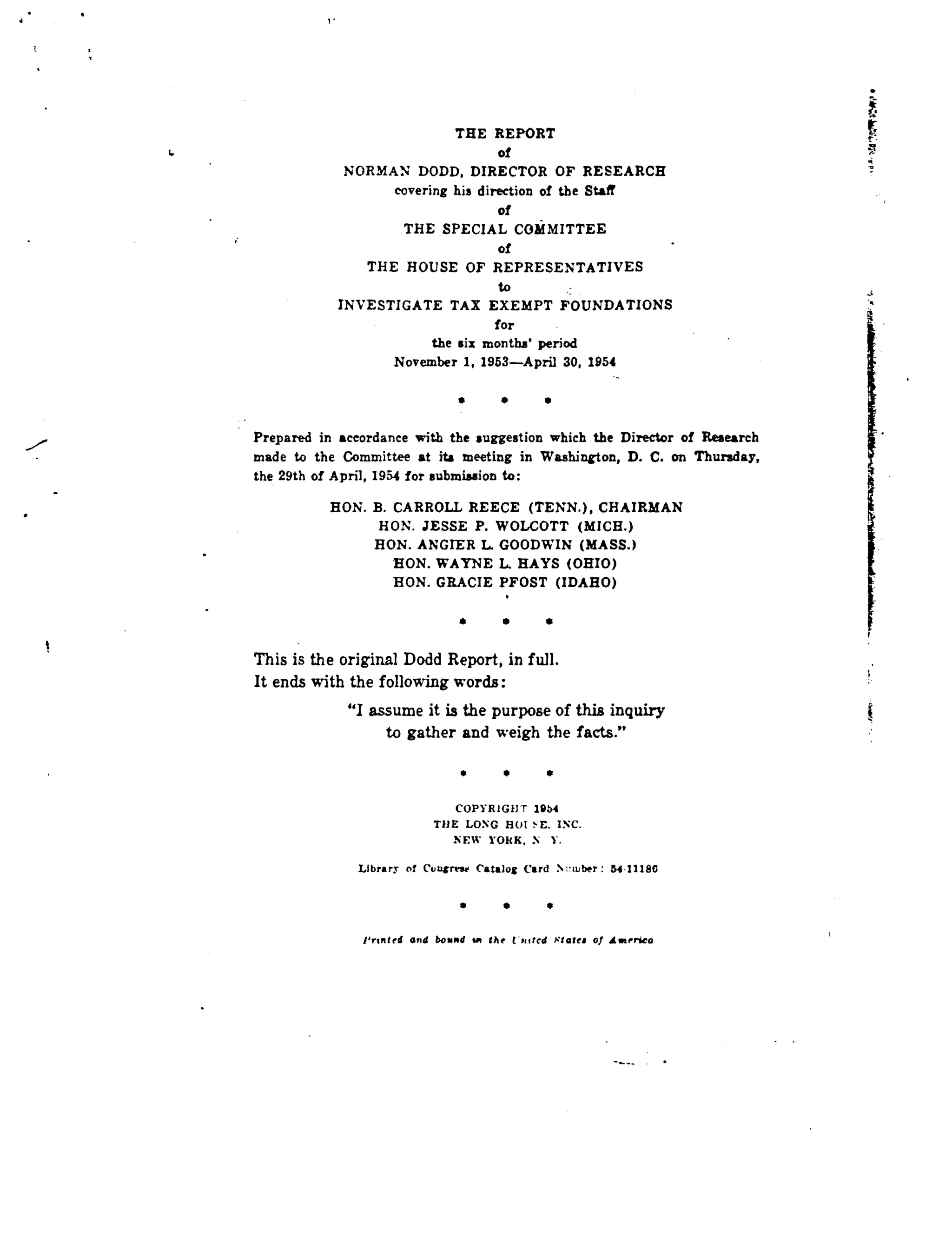 This document is the original 1954 report by Norman Dodd, the director of research for the Reece Committee, which investigated tax-exempt foundations. The report provides definitions used in the study, summarizes criticisms of a previous investigation by the Cox Committee, and outlines Dodd's approach and findings. Dodd discovered that certain foundations had collaborated over decades to shift American education toward an international perspective and away from its traditional principles, with the goal of influencing government policy. His study traced how this relationship developed between foundations, education, and the executive branch of government since 1903.