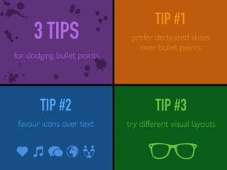 This document provides tips for creating presentations without using bullet points. It discusses how bullet points are a bad practice as audiences quickly read slides before the presenter talks about them. Bullet points tend to have a lot of text in each line, look the same, and are boring and hard to remember. The document recommends using dedicated slides instead of bullet points, favoring icons over text to help audiences remember messages, and trying different visual layouts to capture attention. Specific tips include using photos and varying visual elements across slides.