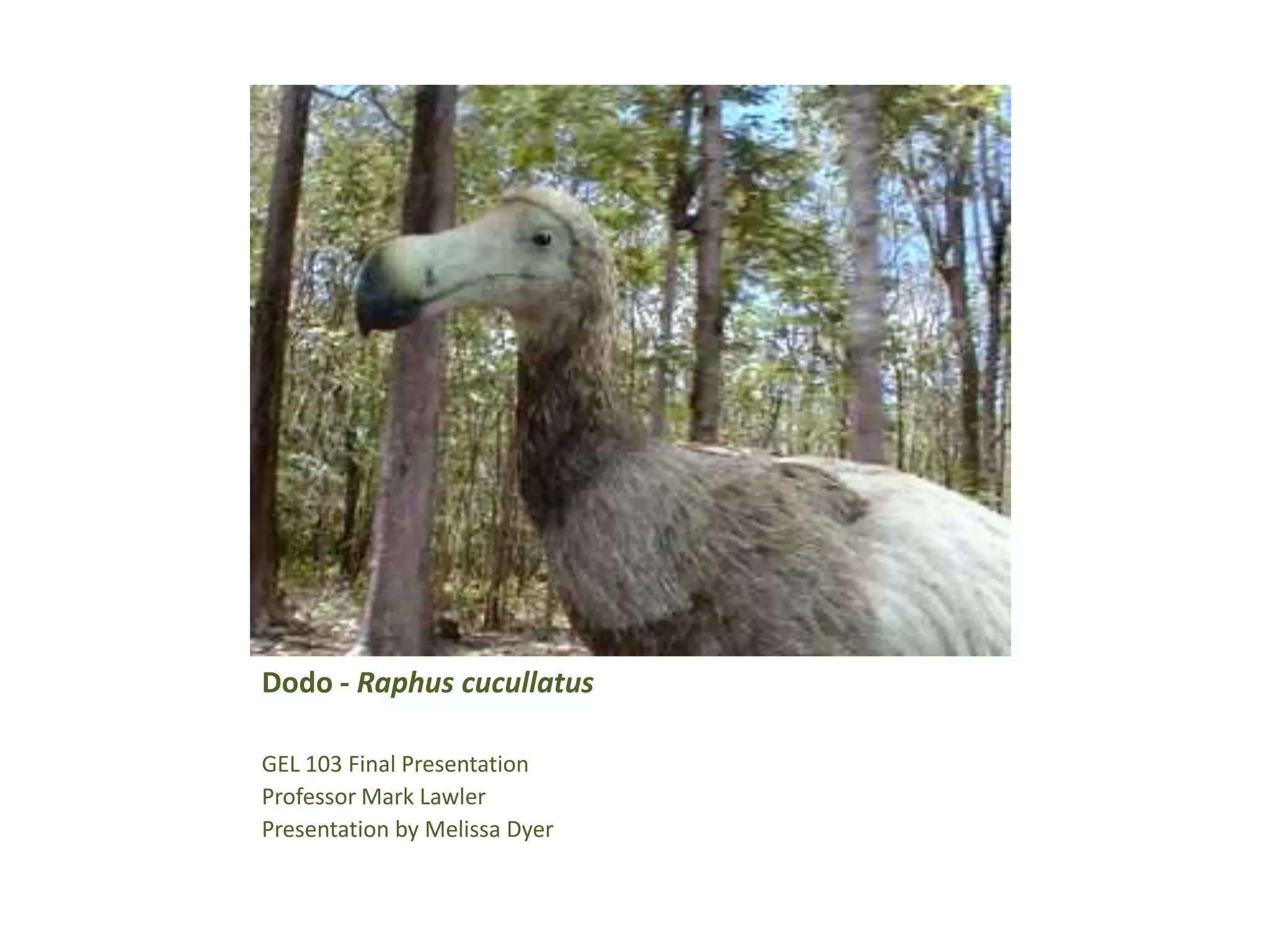 The document summarizes information about the extinct dodo bird. It describes the dodo's physical characteristics, habitat on the island of Mauritius, ancestral connections to other pigeon species, and cause of extinction due to overhunting and introduction of predators when humans arrived. The document also discusses efforts to extract and analyze dodo DNA to better understand its genetic relationships and the possibility of cloning the species in the future, though completely recreating the dodo would be impossible due to degradation of its genetic code over time.