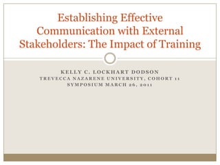 This document summarizes a study on the impact of training on school administrators' communication competencies and attitudes regarding external stakeholders. The study found that administrators who received training scored significantly higher on knowledge, application, and attitude assessments compared to a control group. Interviews also revealed administrators had more positive attitudes following positive interactions with the media compared to unpleasant interactions. The study recommends more communication training for administrators and further use of assessment tools to evaluate training impact.