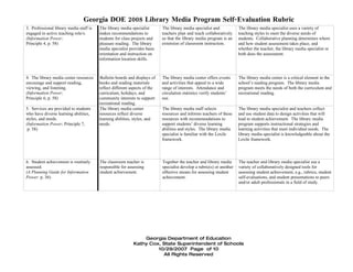 The document provides a rubric for evaluating library media programs at basic, proficient, and exemplary levels across 5 categories: student achievement and instruction, staffing, facilities/access/resources, administrative support, and staff development.