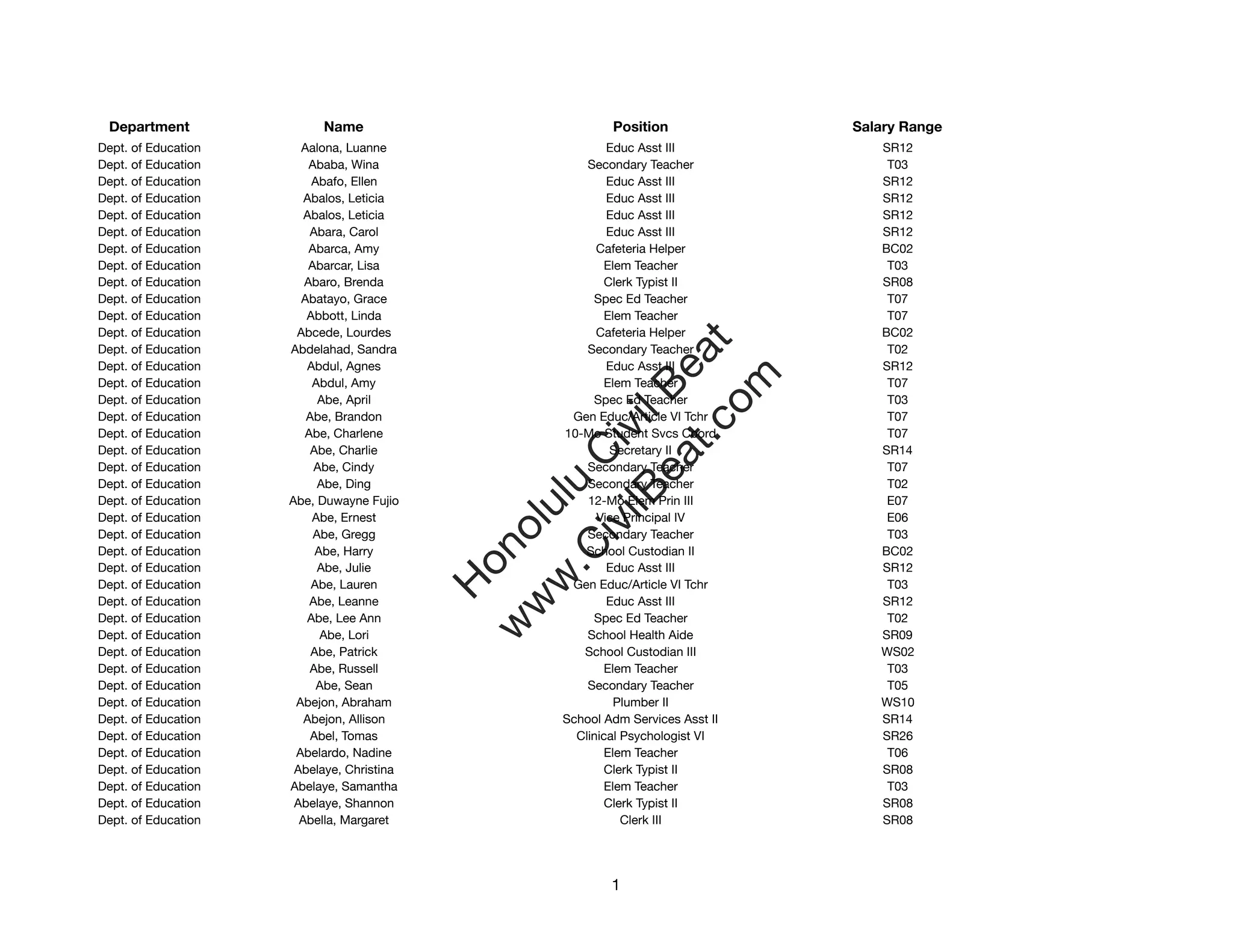 This document contains a list of employees in the Department of Education including their name, position, and salary range. There are over 200 employees listed from a variety of roles such as teachers, administrators, custodians, and other support staff. The positions range from educators and teachers to cafeteria helpers and secretaries. The salary ranges vary significantly depending on the position and level of experience. This appears to be a roster of all personnel employed by the Department of Education.