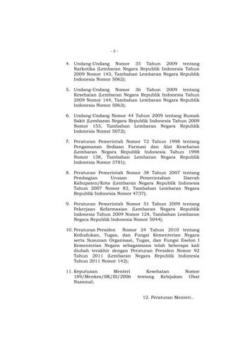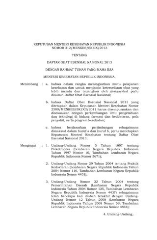 Keputusan Menteri Kesehatan Republik Indonesia nomor 312/menkes/sk/ix/2013 menetapkan daftar obat esensial nasional 2013 untuk meningkatkan mutu pelayanan kesehatan dan menjamin ketersediaan obat. Daftar ini merupakan revisi dari daftar sebelumnya yang harus disesuaikan dengan perkembangan ilmu pengetahuan, ketersediaan obat, serta transparansi dalam proses penyusunan. Penerapan daftar obat esensial ini harus dilaksanakan secara konsisten di semua fasilitas pelayanan kesehatan di seluruh Indonesia.