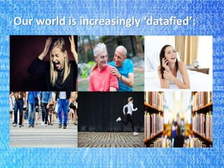 The document discusses the transformative impact of big data on various industries, hinting at both opportunities for increased margins and the risks associated with failed implementations. Despite the potential, many organizations struggle with data management, slow insights, and subjective biases in analysis, leading to a high failure rate of big data projects. It emphasizes the need for a deeper understanding of the 'human in the data' and advocates for a multi-disciplinary approach to analytics that includes cognitive and behavioral insights.