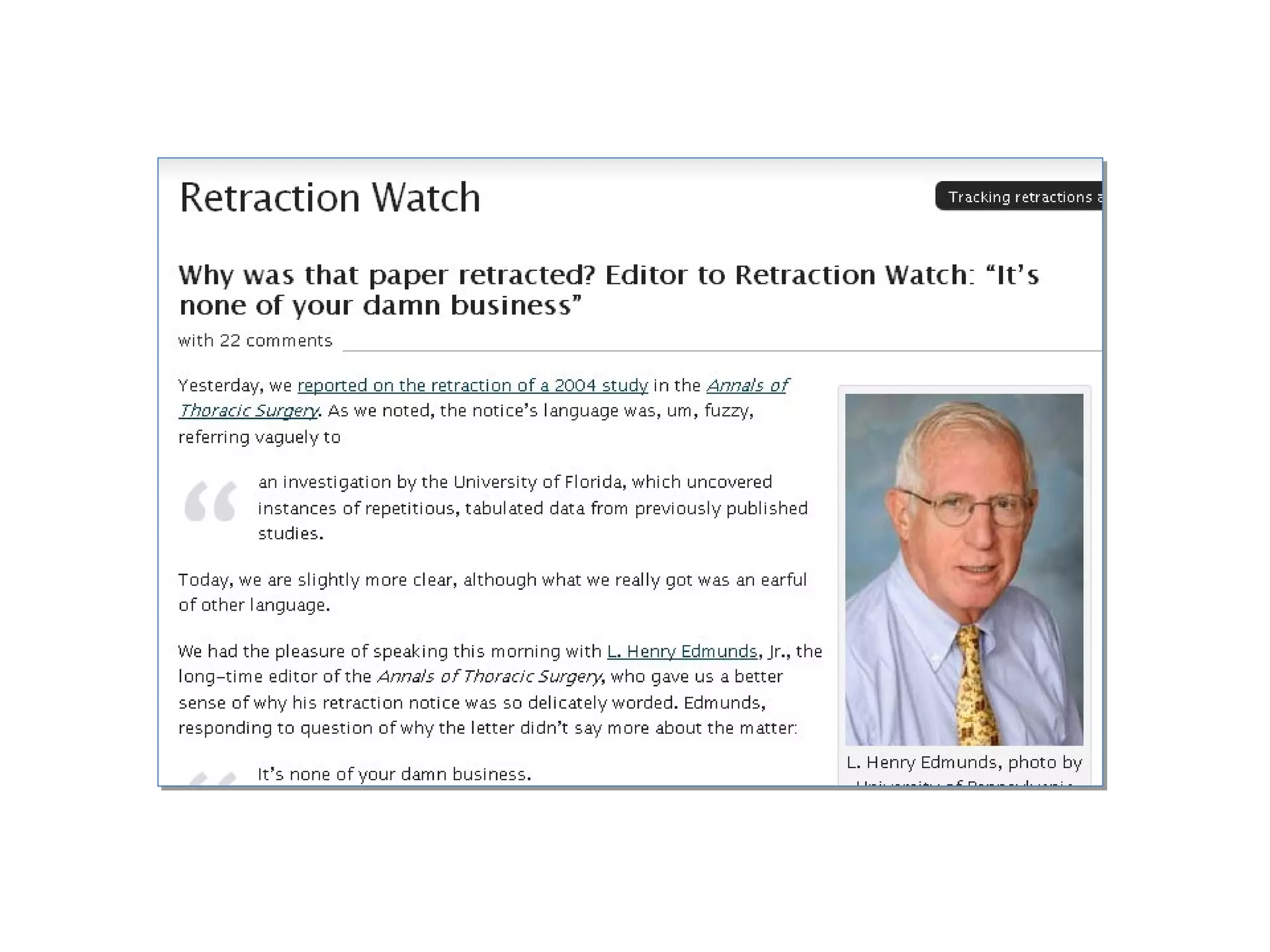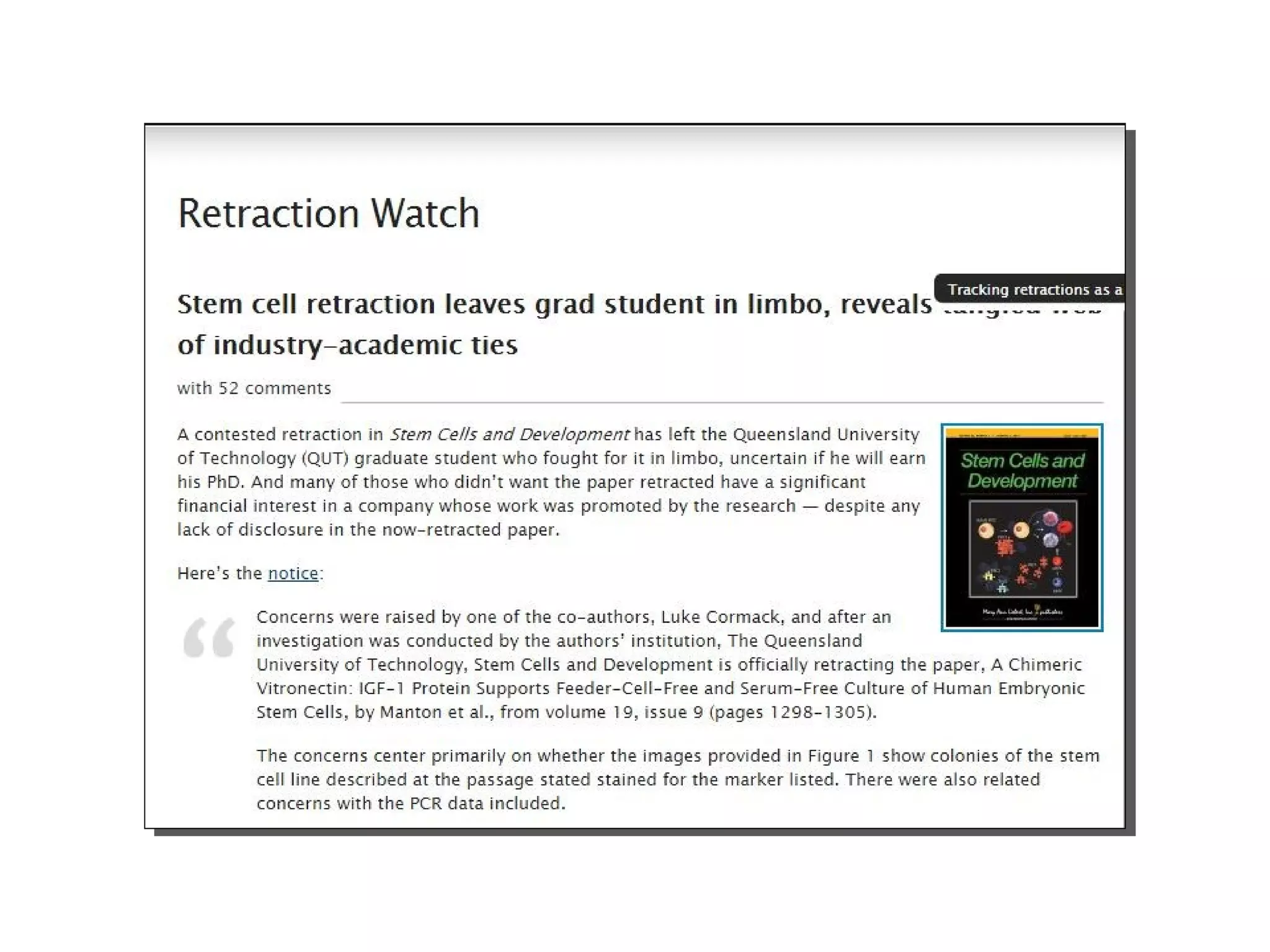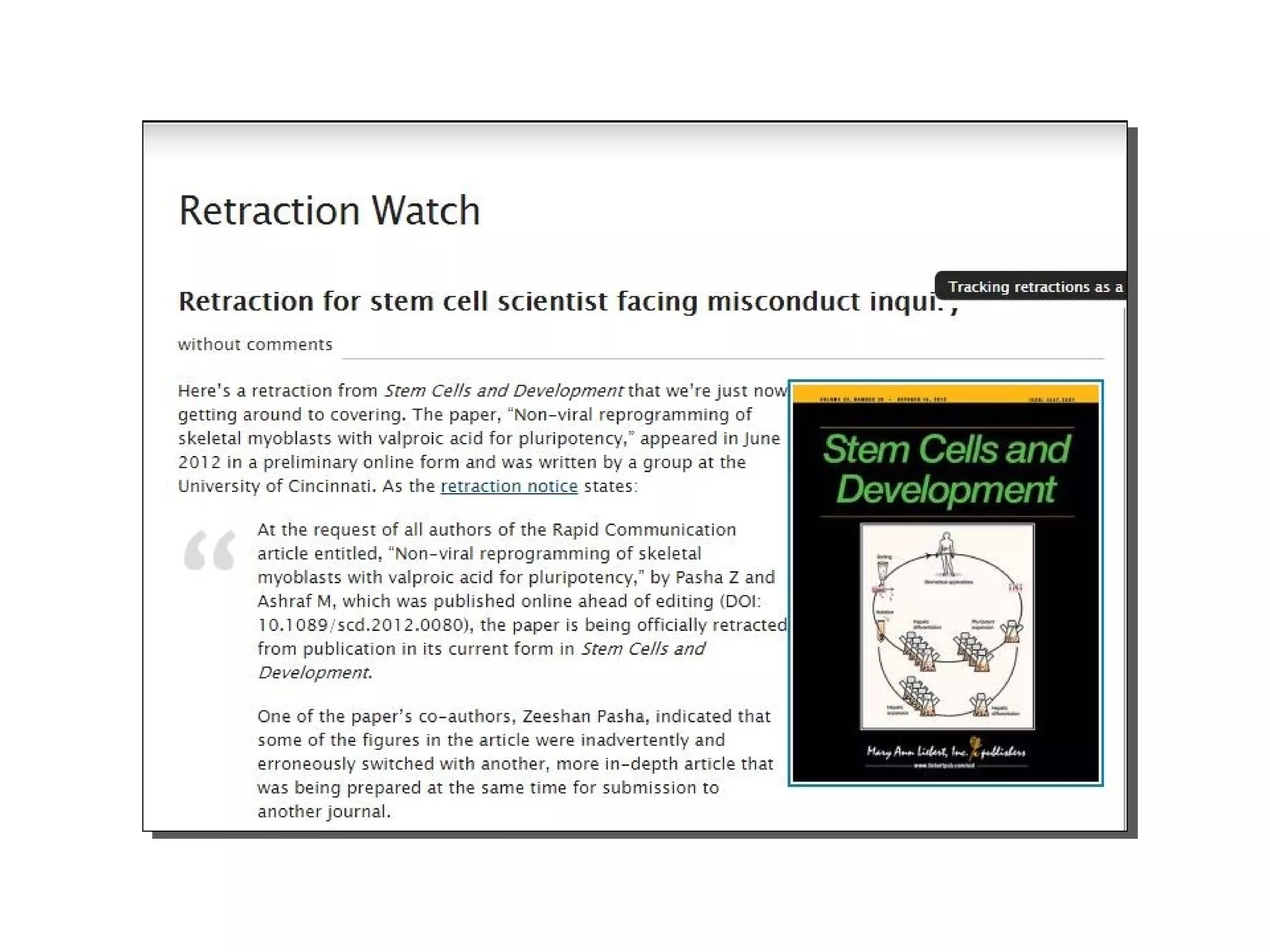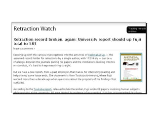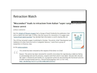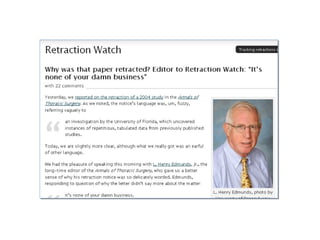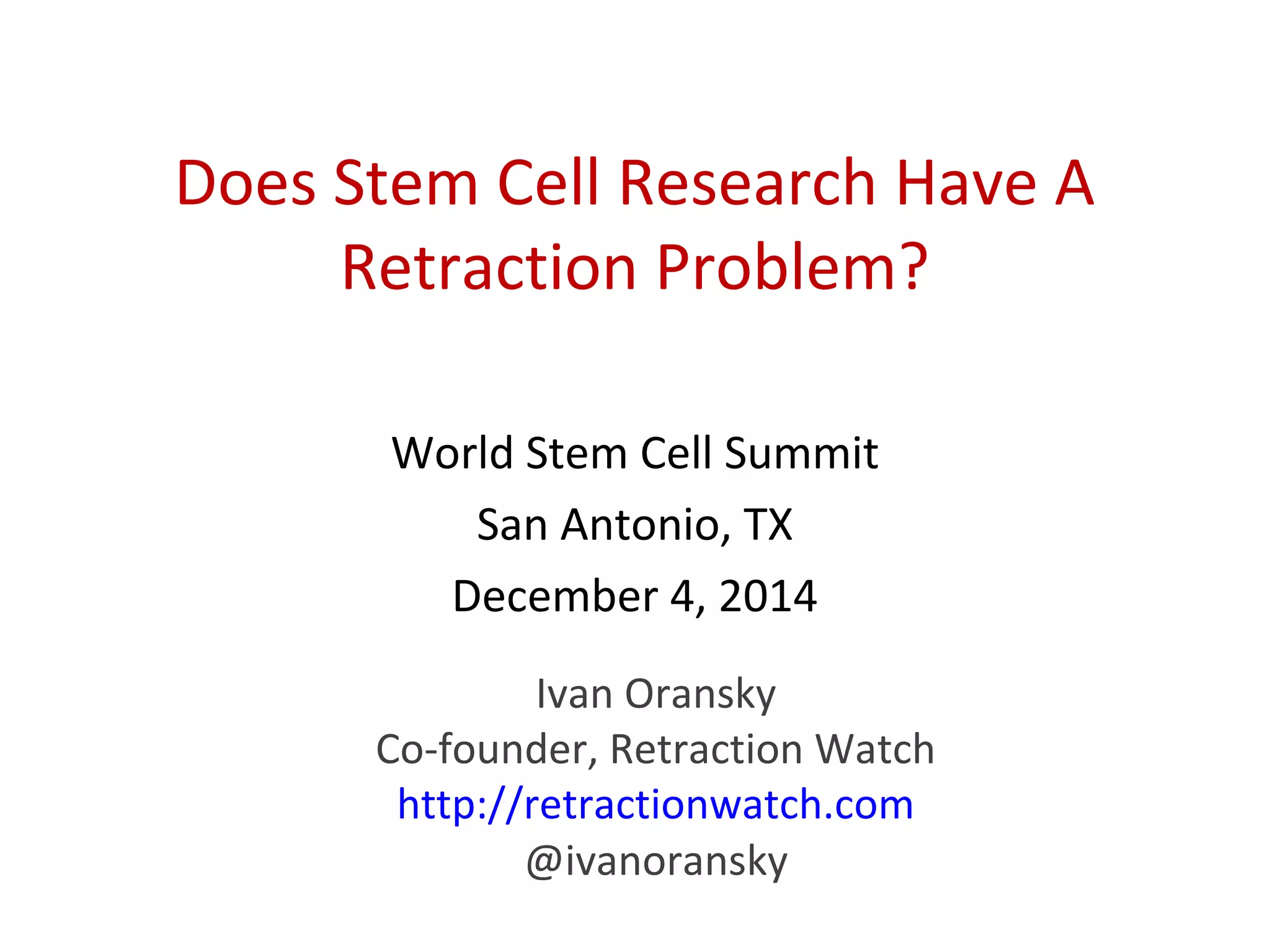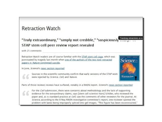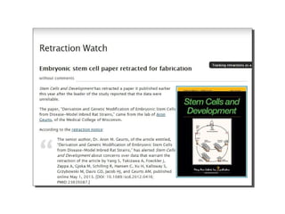 Ivan Oransky presented on retractions in stem cell research and the rise of post-publication peer review. He discussed that retractions have been increasing in recent years, with most due to misconduct. Journals are also listening more to concerns raised on sites like PubPeer and sometimes retracting papers due to image manipulation issues. Doing the right thing and addressing errors pays off for journals' credibility in the long run.