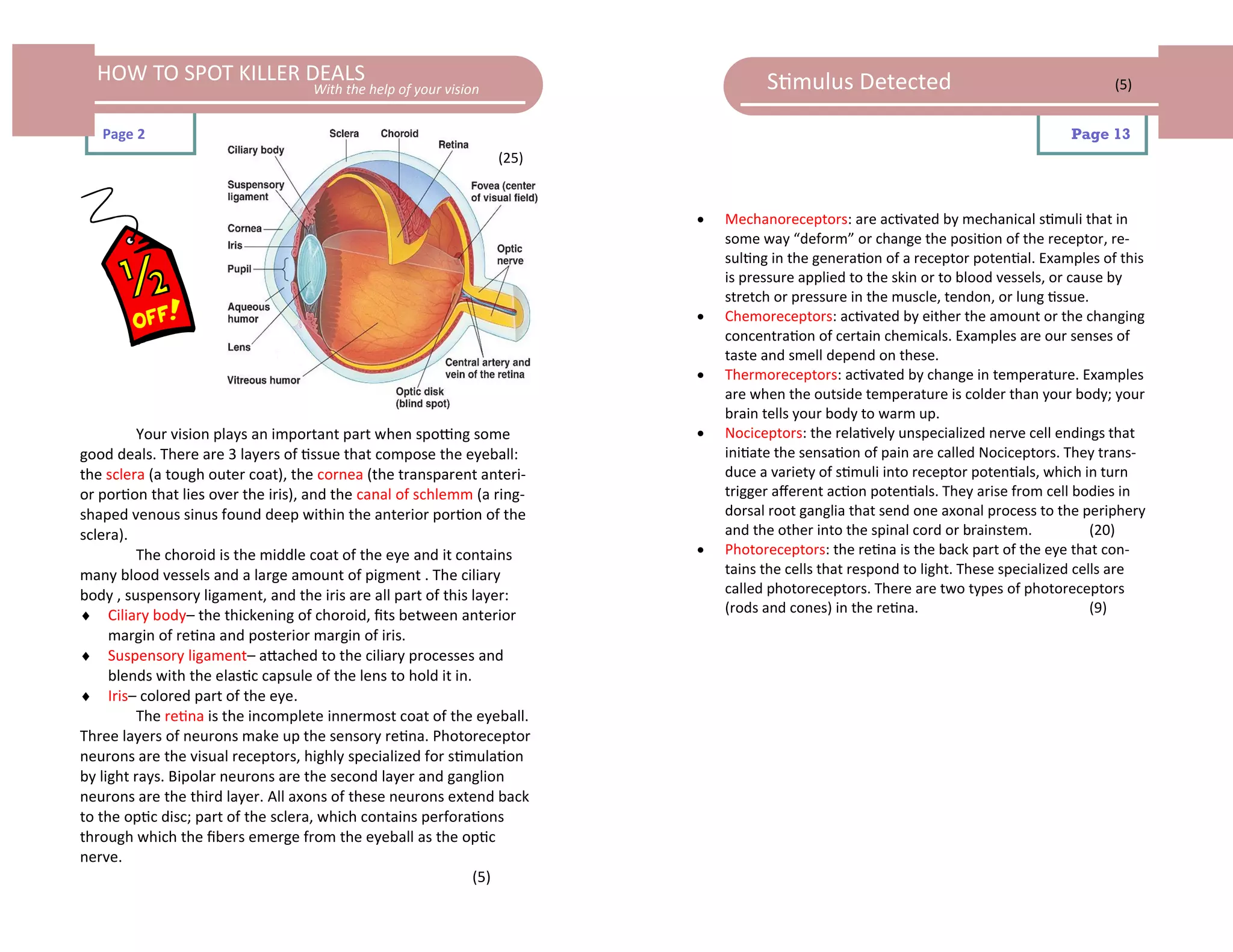 Free nerve endings are the simplest sensory receptors located throughout the body and skin. They detect sensations like pain, touch, heat and cold. Other receptor types include Merkel disks for light touch, Meissner corpuscles for vibration, and muscle spindles and Golgi tendon organs in muscles and tendons that provide information on movement and positioning. The eye contains receptors for vision, with the retina containing rods and cones that detect light as the visual photoreceptors. Other receptors in the body are classified as exteroceptors on the skin, visceroceptors inside organs, and proprioceptors in muscles, tendons and joints.