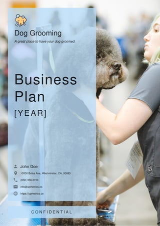 The document is a business plan template for a dog grooming business called Maxwell Groomers. It provides details on the company's mission, vision, products/services, market analysis, strategy, operational plan and financial projections. The plan aims to establish Maxwell Groomers as the top dog grooming service in Detroit by ensuring customer satisfaction and developing a loyal client base.