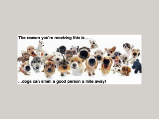 - The document discusses the close bond between dogs and humans through various quotes and sayings about dogs.