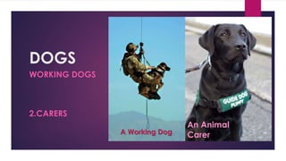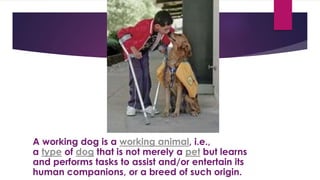 This document discusses different types of working dogs and their roles. It focuses on military working dogs, including a 3-legged Belgian Malinois named Layka that was featured on the cover of National Geographic. Layka was wounded in Afghanistan but continued serving, and she recently skydived to test a new canine combat vest designed to improve performance and safety for military dogs. The document also briefly mentions sled dogs, therapy dogs including the first therapy dog Smoky in WWII, and the benefits of animal therapy.