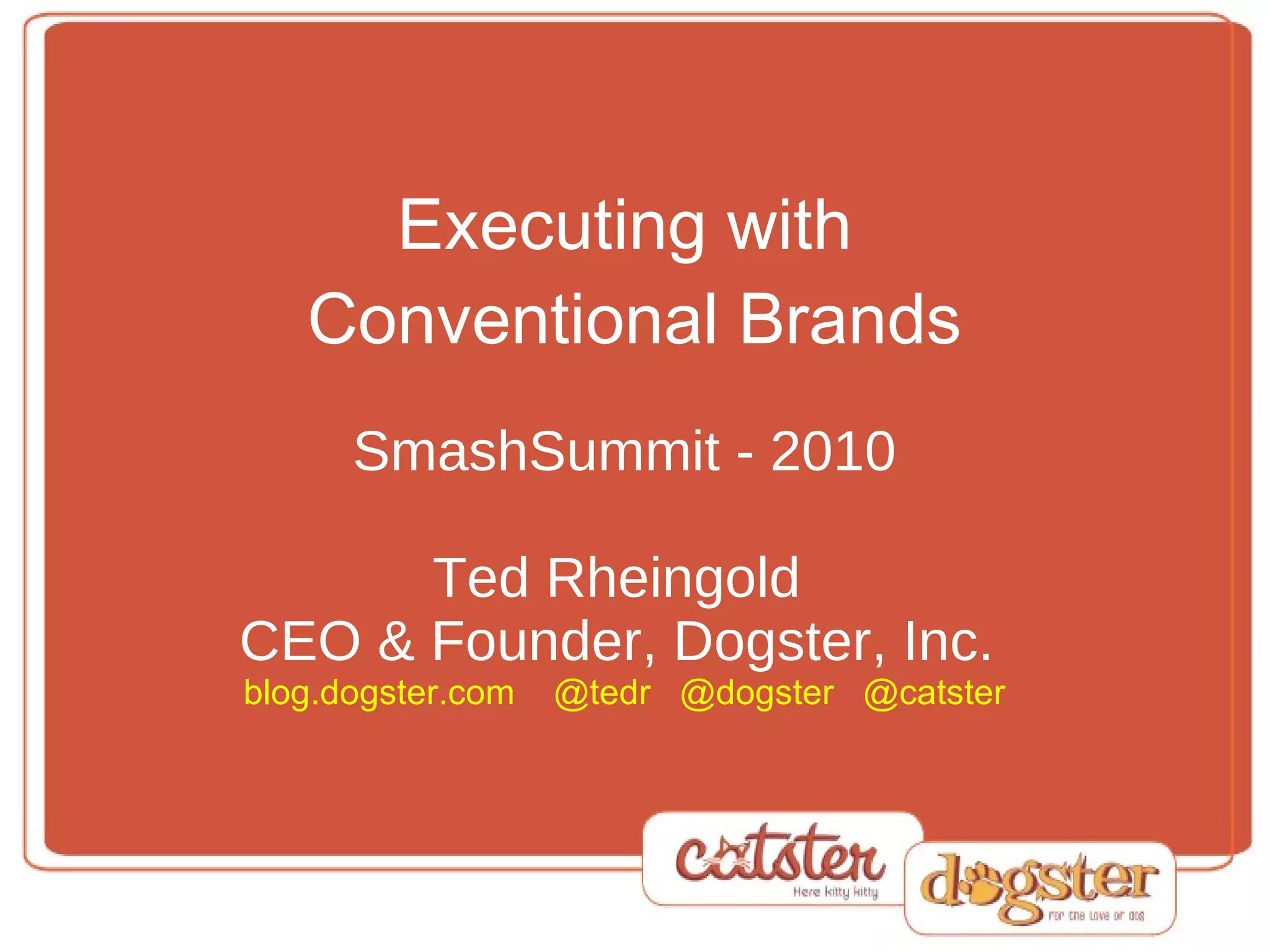 Ted Rheingold, CEO and founder of Dogster, Inc., gave a presentation at SmashSummit in 2010 about executing with conventional brands. The presentation discussed building a better product or service, providing excellent customer service, envisioning the brand relationship, working with large established brands like General Motors, dealing with consensus processes within brands, focusing on legacy over short term gains, and speaking plainly to brands about opportunities. The presentation also included a section on brands Dogster has worked with.