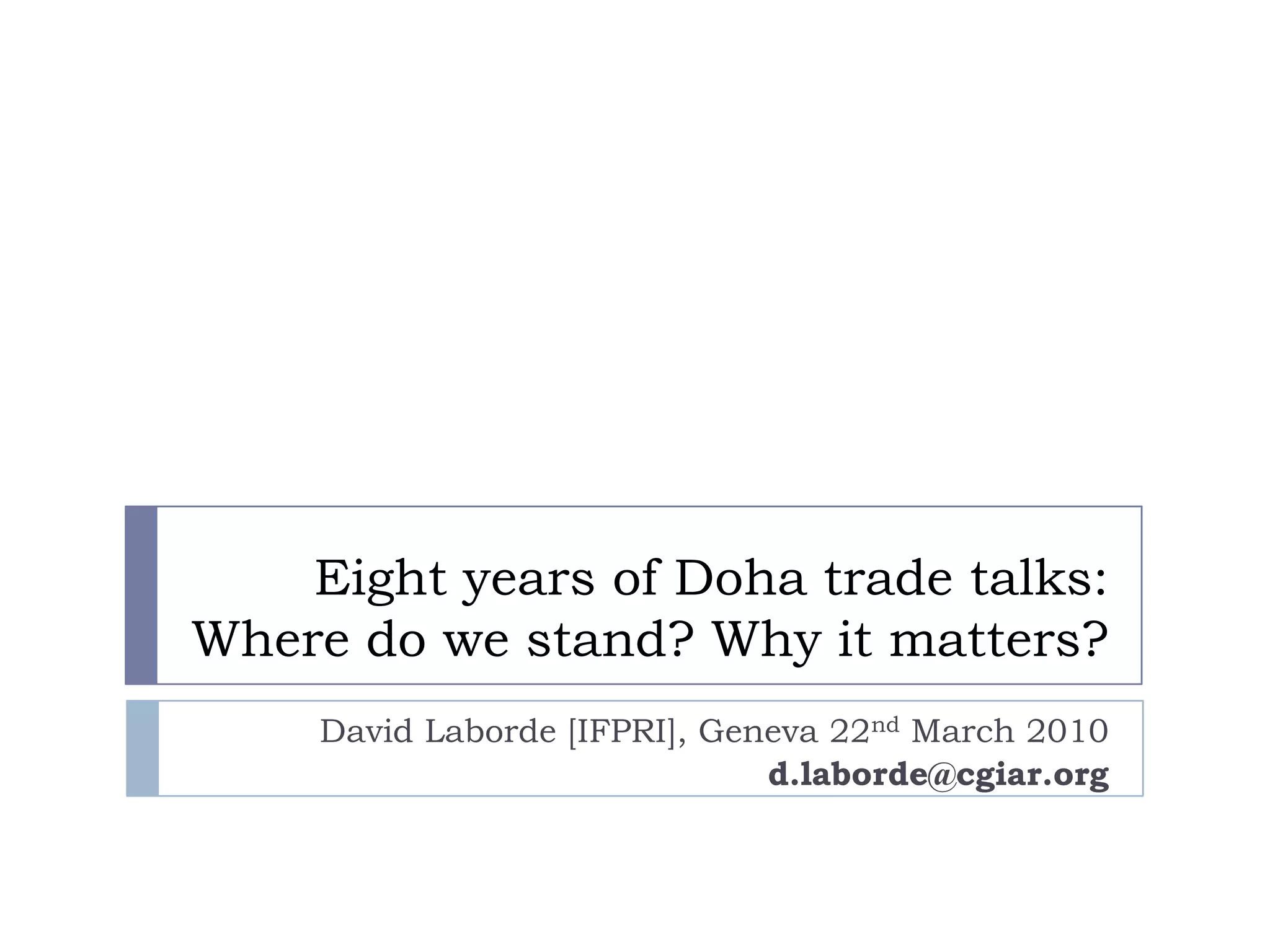 The document summarizes the status of negotiations in the Doha Development Round after eight years. It finds that while negotiations have evolved, the core issues remain difficult with an ongoing trade-off between ambition, fairness, and domestic political constraints. Economic modeling is used to analyze the impacts of potential agreements on trade, welfare, and development outcomes. Flexibilities are important for developing countries but come at the cost of reduced gains. An agreement could help secure existing liberalization but the economic and political context may be challenging.