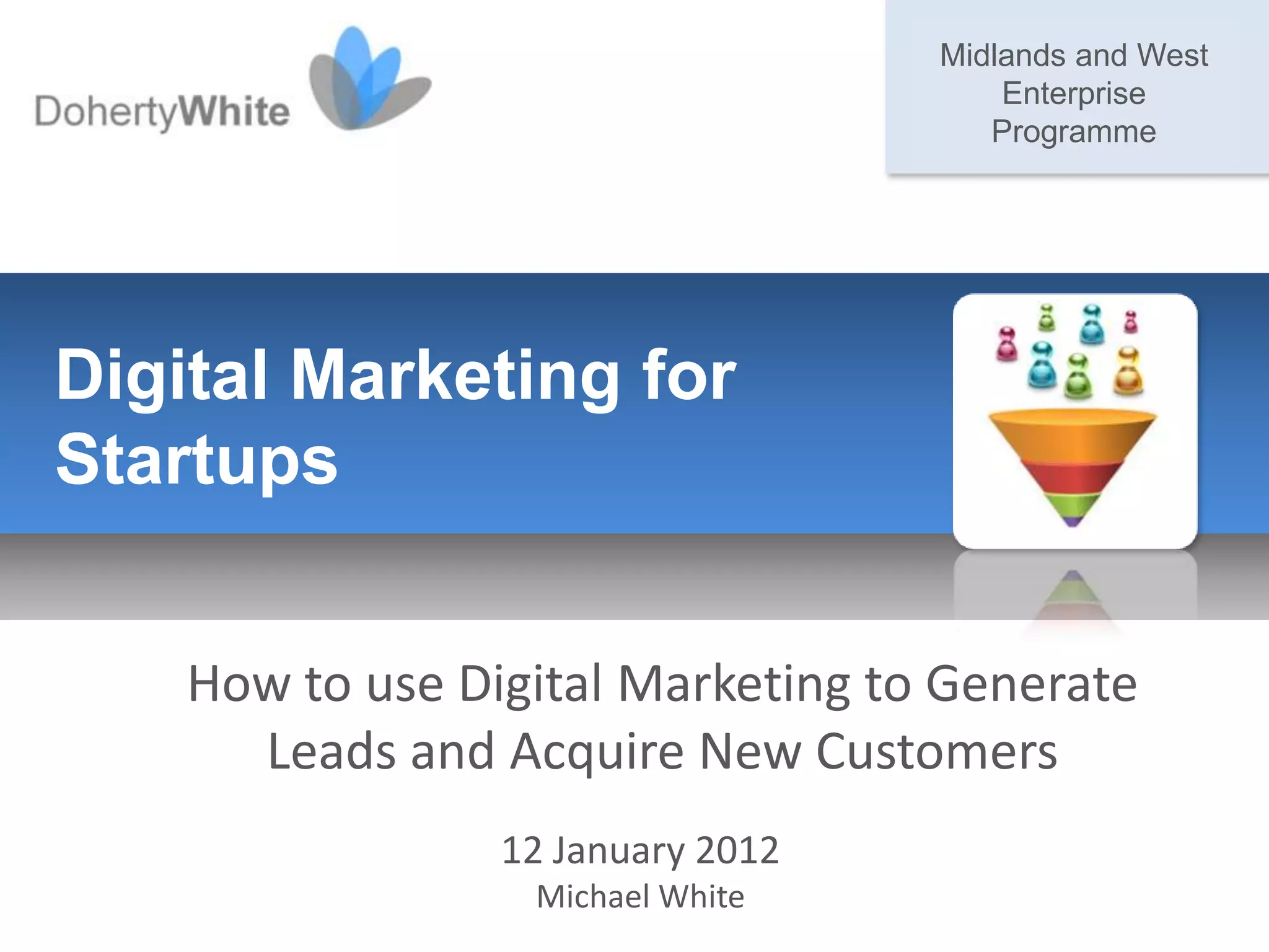 The document details a seminar on digital marketing strategies tailored for technology startups, outlining key topics such as the importance of digital marketing for lead generation, building value propositions, and understanding target buyers. It emphasizes the tools and techniques, including SEO, social media, and content creation, necessary for acquiring customers online. The guide also stresses the necessity of focusing marketing efforts on specific buyer personas and maintaining engagement through various online channels.