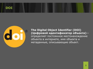 Документ описывает использование цифрового идентификатора объекта (DOI) в научной коммуникации, подчеркивая его значение для быстрого поиска и доступности научных статей. DOI гарантирует актуальность местонахождения публикации, улучшает видимость и авторитетность журналов, а также упрощает учет цитирования. Обсуждаются также технические аспекты присвоения DOI и интеграция с международными базами данных.