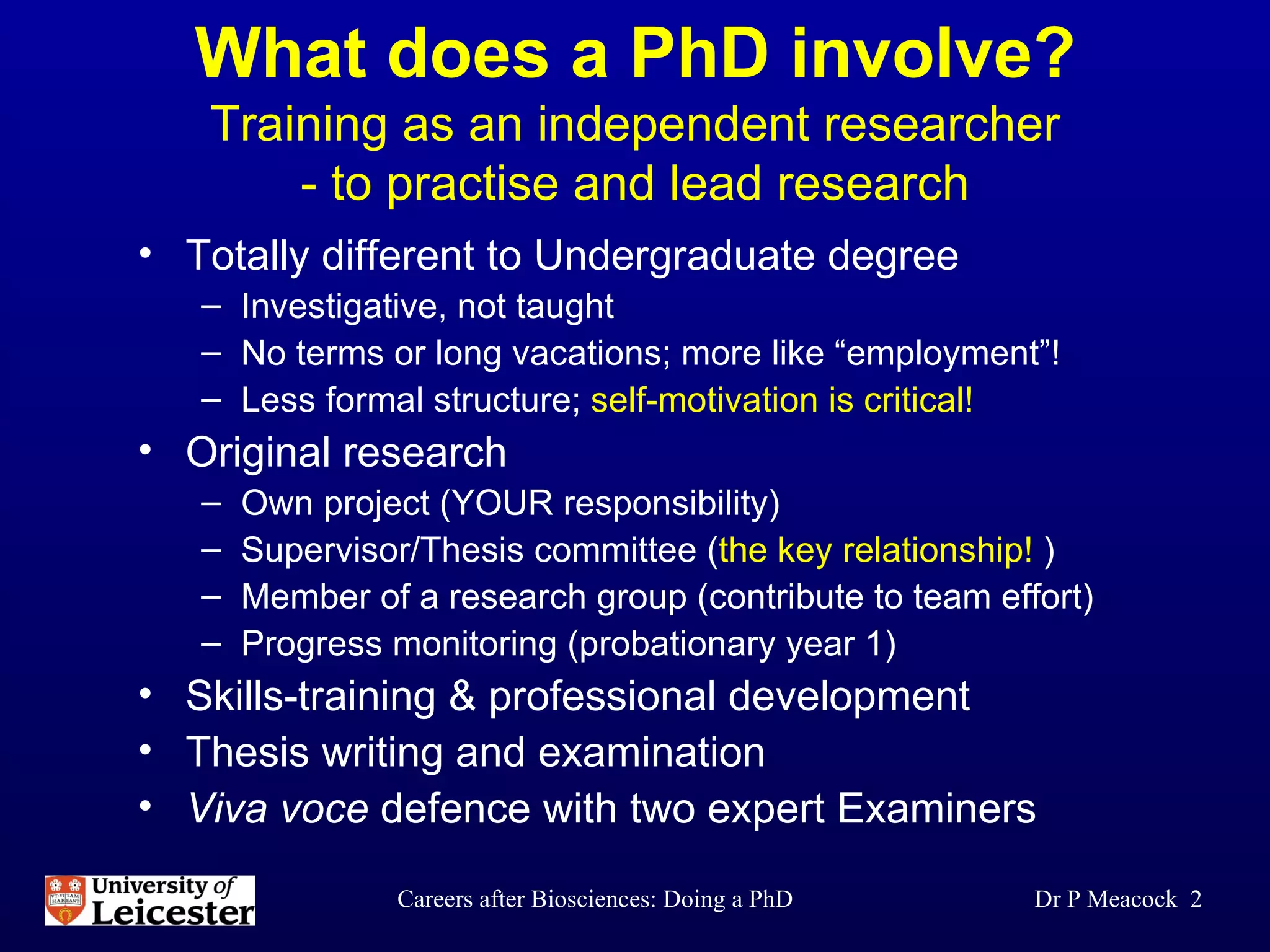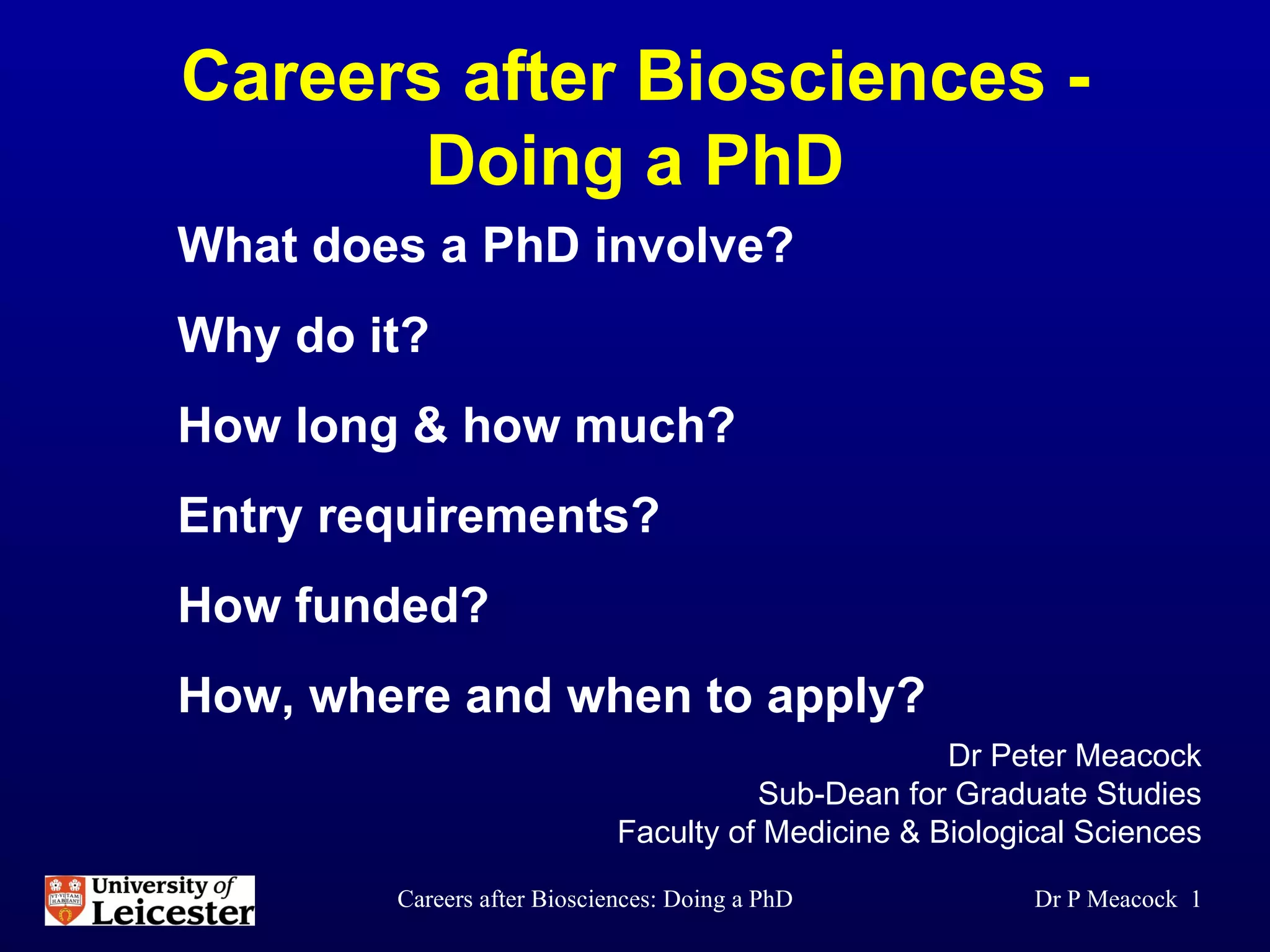 The document provides an overview of pursuing a PhD in biosciences, discussing its structure, entry requirements, funding options, and the application process. It emphasizes the importance of being self-motivated and highlights potential career advancements and skills gained through the program. It also outlines costs, duration, and resources for finding PhD opportunities and preparing for applications.