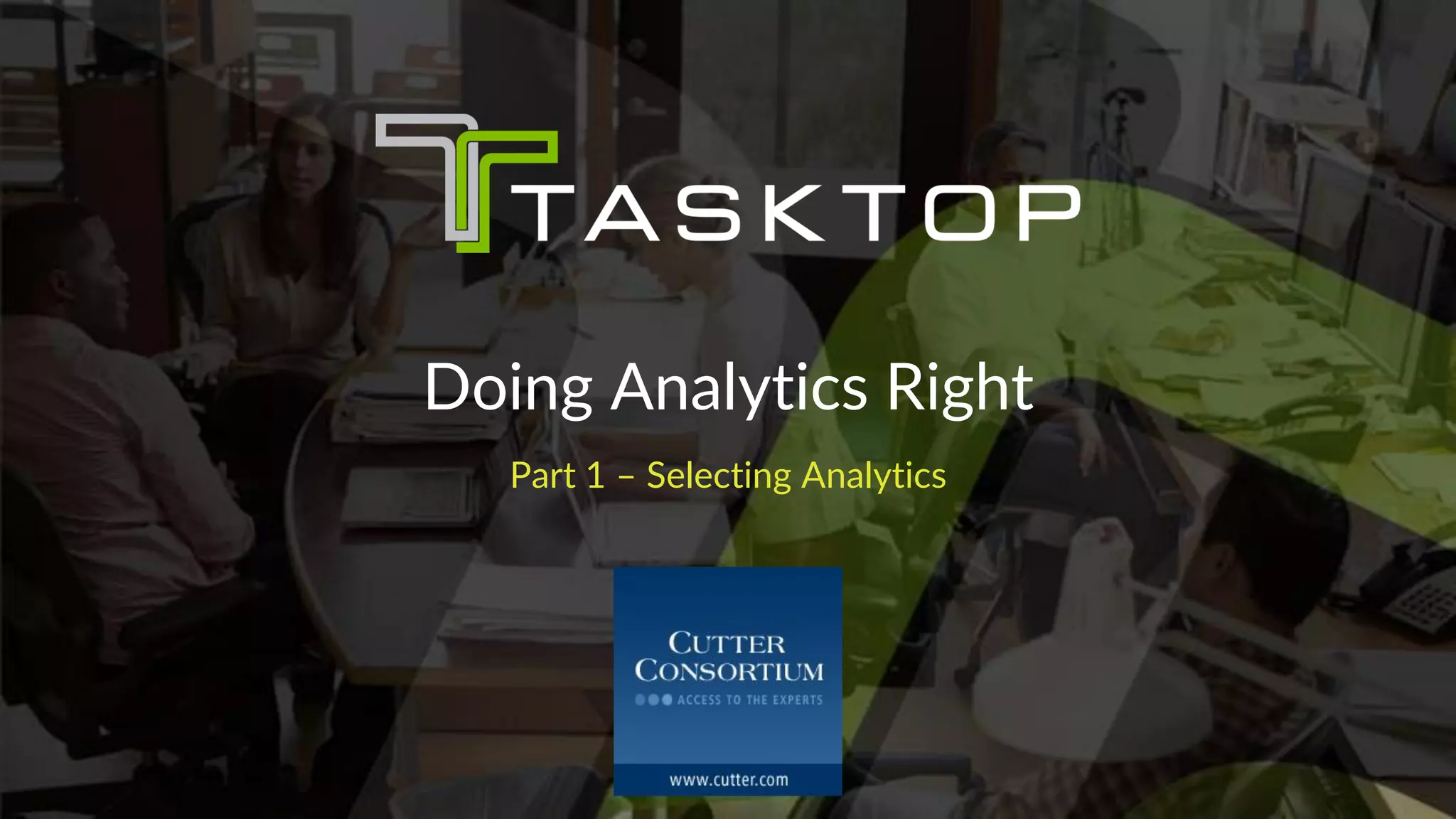 This document discusses the importance of selecting appropriate analytics aligned with organizational goals, emphasizing a structured process for choosing metrics, designing analytical solutions, and building supportive environments for data management. It outlines different types of work efforts and corresponding analytics needed for effective measurement and improvement within teams and organizations. Key considerations include the mixture of work efforts, the organization’s structure, and the need for feedback loops to respond to metrics effectively.