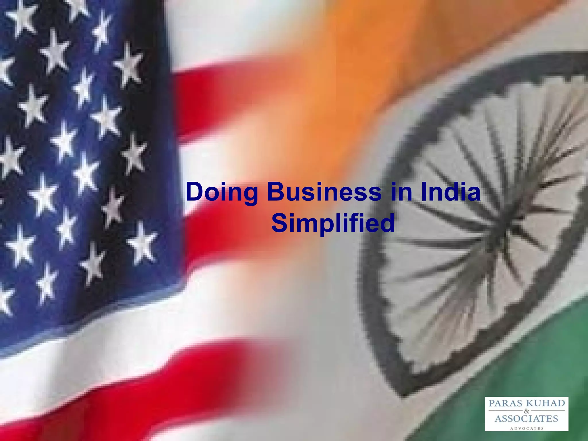 The document provides an overview of doing business in India. It discusses that India welcomes foreign investment in many sectors under an automatic approval route or FIPB approval route. Key sectors that are attractive for foreign investment include IT/ITES, biotechnology, manufacturing, tourism, infrastructure and energy. The document also summarizes India's tax regime, laws governing business, and common forms of business enterprises like joint ventures, wholly owned subsidiaries, liaison offices and project offices.