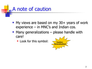This document provides reflections and suggestions for doing business in India. It begins with a note of caution about generalizations. It then outlines India's Vision 2020 of transitioning to a knowledge economy. For strategy, it recommends treating plans like jazz tunes with room for improvisation. Implementation requires maximizing parent involvement, ensuring diversity, and two-way staff movement. Understanding the cultural orientations of hierarchy, relationships, and nonlinear thinking is key. Suggestions include building long-term relationships, recognizing hierarchy, flexibility, and a task orientation that follows people orientation. The overall message is one of seeing India as diverse but also recognizing cultural tendencies to achieve business success.