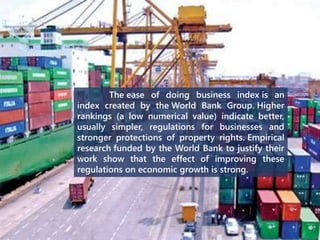 The Ease of Doing Business Index, created by the World Bank Group, evaluates regulations affecting businesses and property rights across 185 economies. Its ranking is derived from an average of ten subindices related to business operations, such as starting a business, obtaining construction permits, and enforcing contracts, among others. The index provides insights into regulatory environments and utilizes contributions from over 9,600 professionals to ensure accurate assessments.