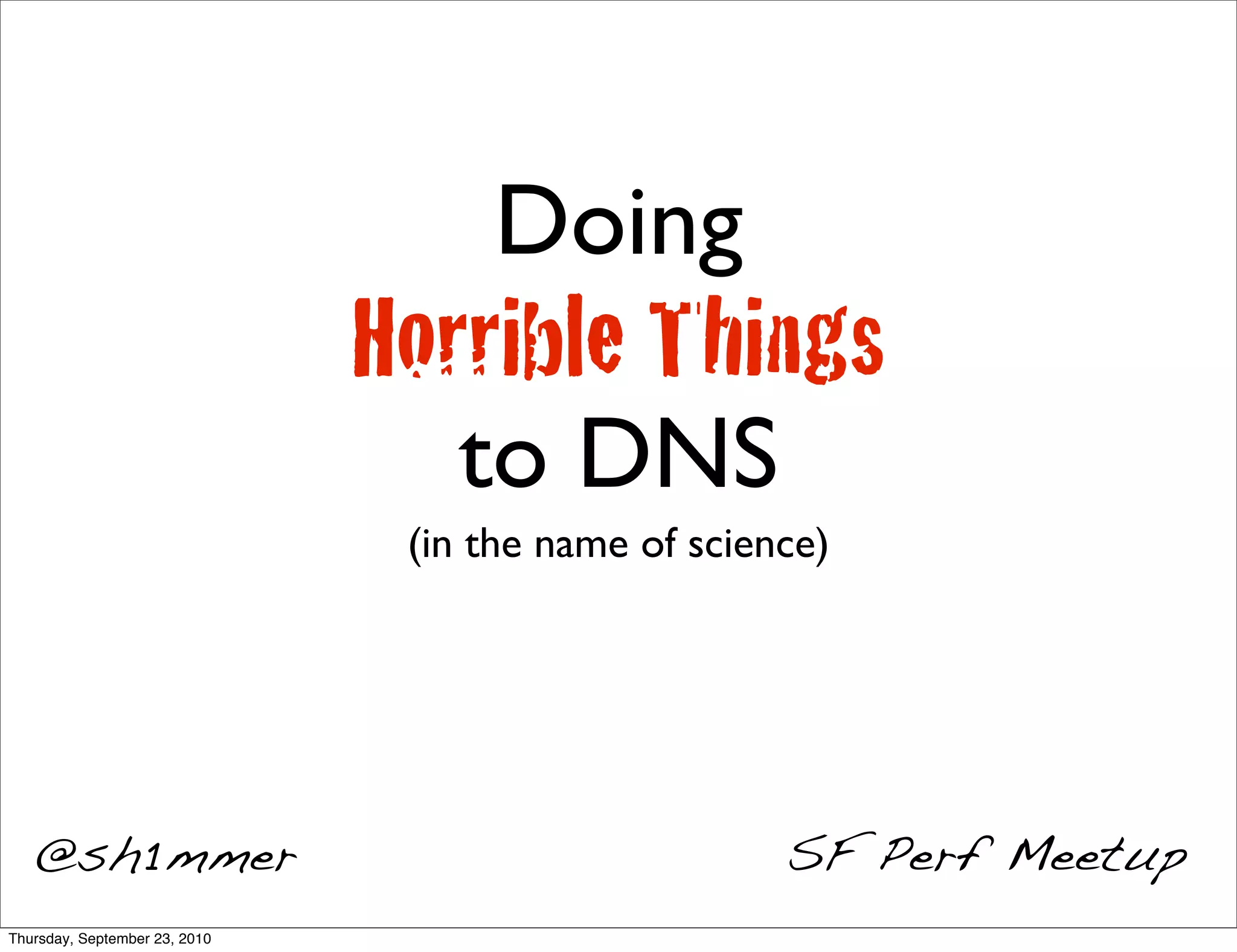 The document discusses techniques for improving website performance through modifications to DNS. It describes how serial HTTP loading is slower than parallel loading due to round trip times for DNS lookups. It then evaluates options for implementing parallel DNS lookups, including using CNAME records to alias multiple hostnames to a single IP address, and placing additional IP addresses in the answer or additional sections of DNS responses to allow parallel lookups. While these techniques could improve performance, they may violate DNS standards or caching assumptions.