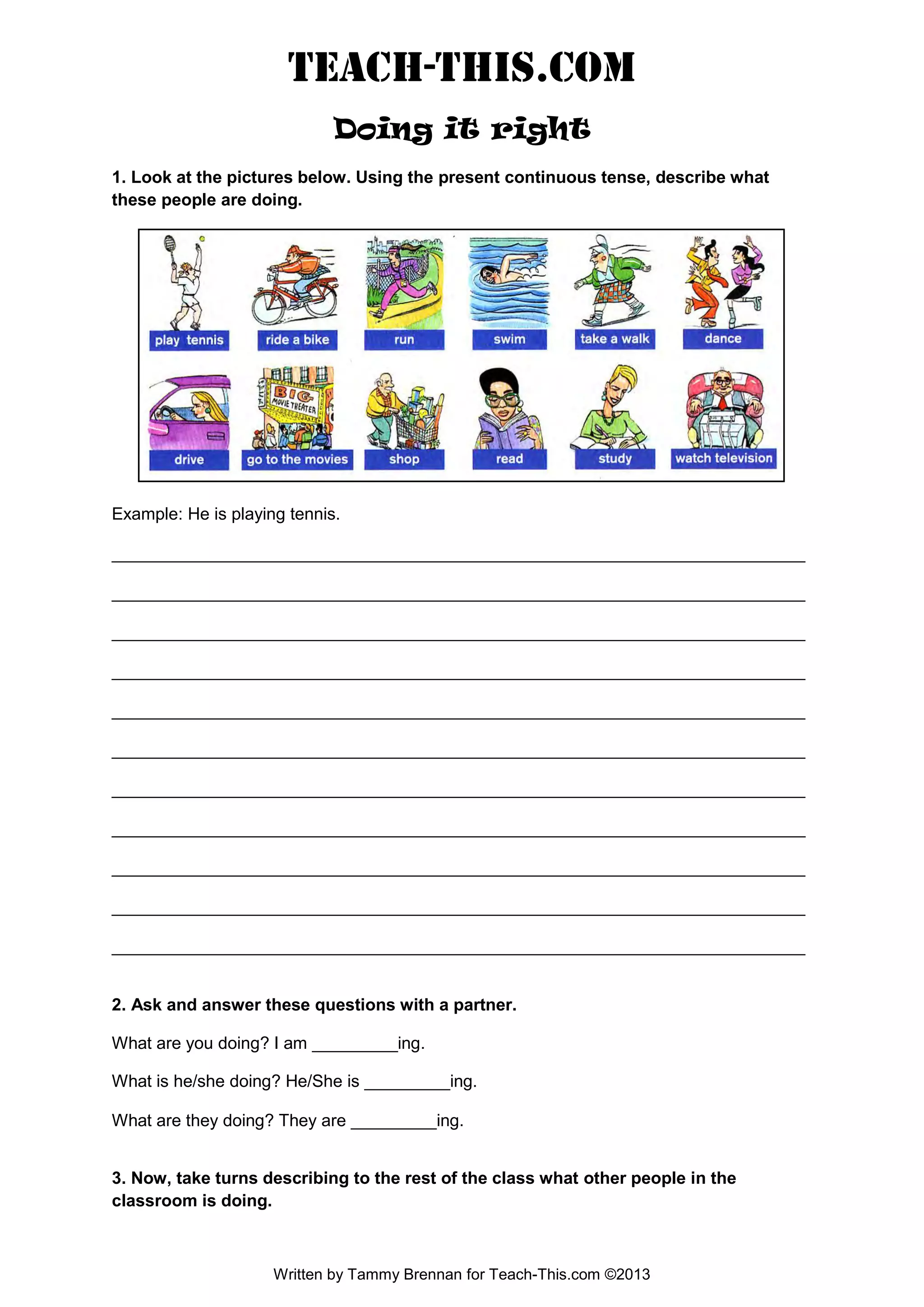 The document provides exercises for an English language lesson on using the present continuous tense. Students are instructed to look at pictures and describe what the people in them are doing in the present continuous tense. They are then asked to ask and answer questions with a partner about what each person is doing using the tense. Finally, students take turns describing to the class what other people present are doing in the present continuous tense.