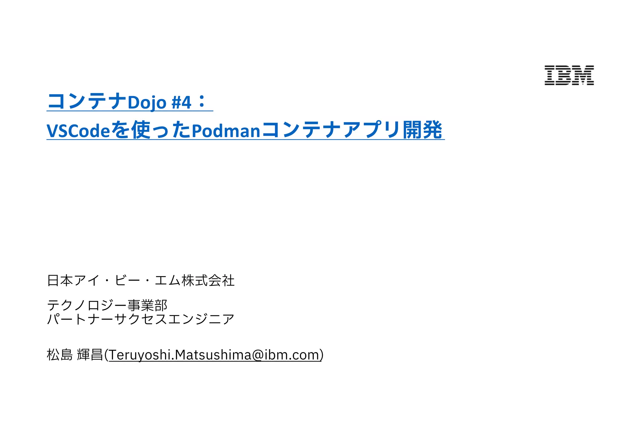 日本アイ・ビー・エム株式会社 テクノロジー事業部 パートナーサクセスエンジニア 松島 輝昌(Teruyoshi.Matsushima@ibm.com) コンテナDojo #4: VSCodeを使ったPodmanコンテナアプリ開発